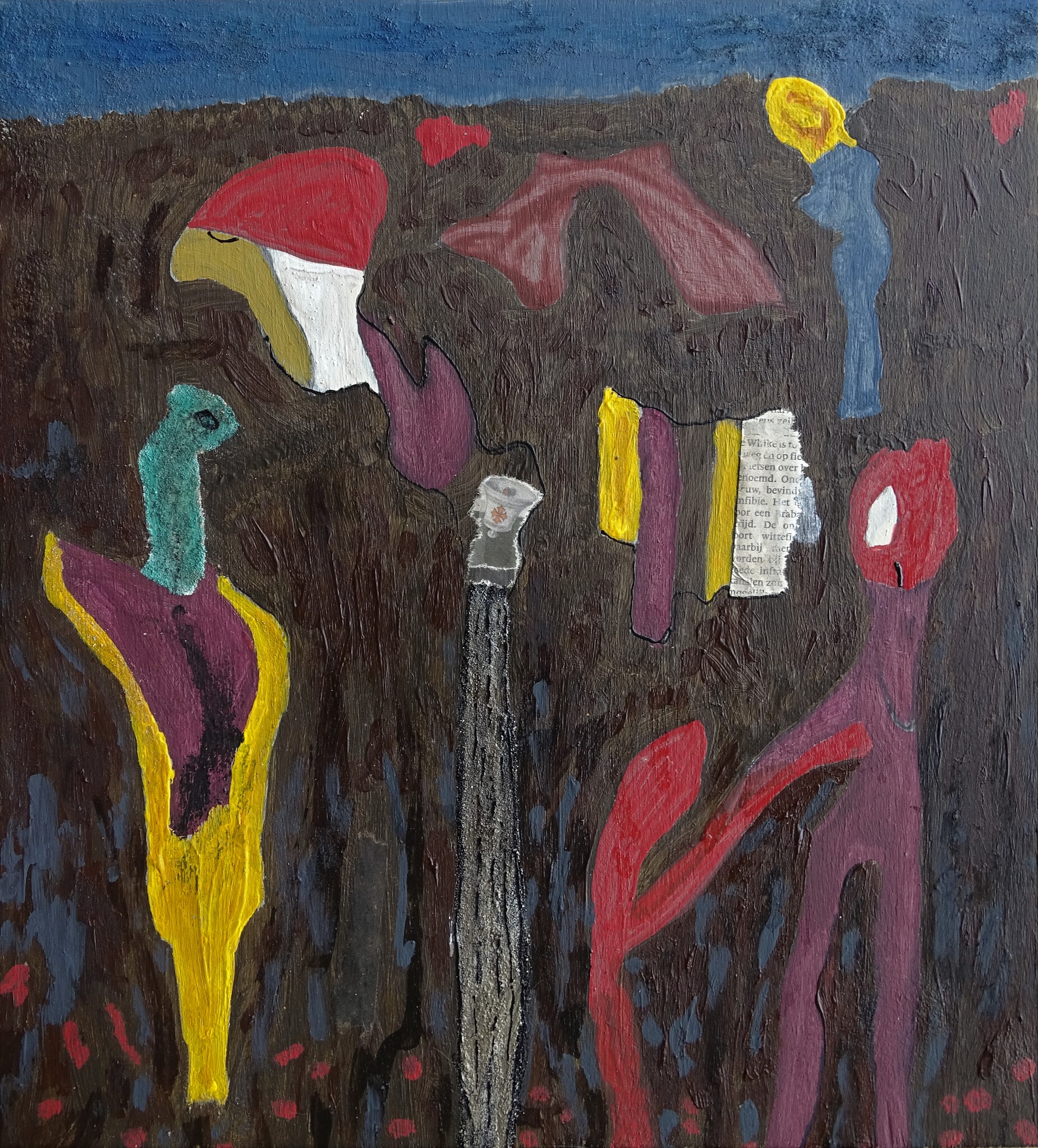 "De figuren verschenen nadat / de vorige scene was uitgewist. // Ze zwijgen over hun zijn in / de onbekende omgeving."