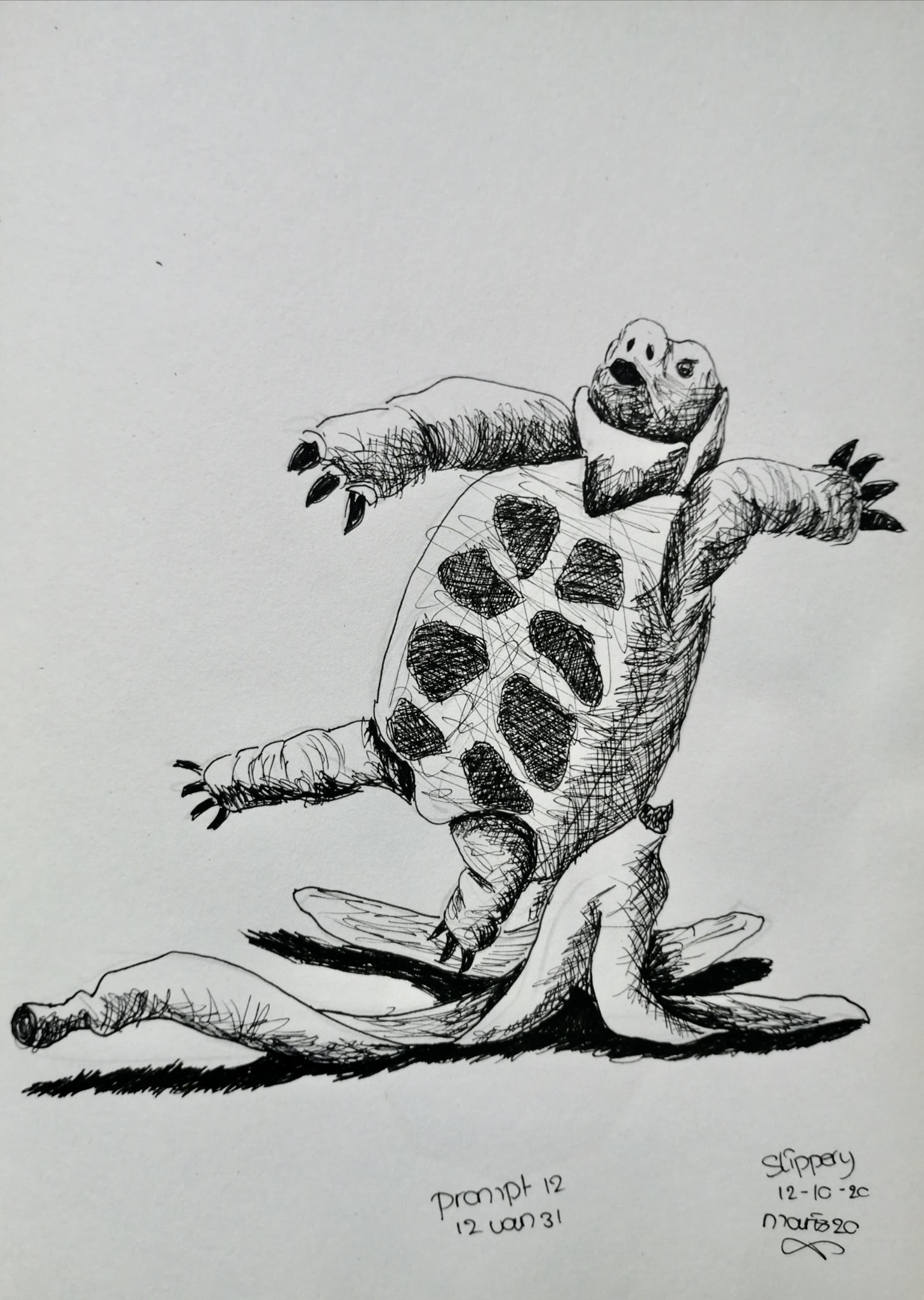 Tekening Inkt Glad Schildpad Banaan Oeps Uitglijden Inktober