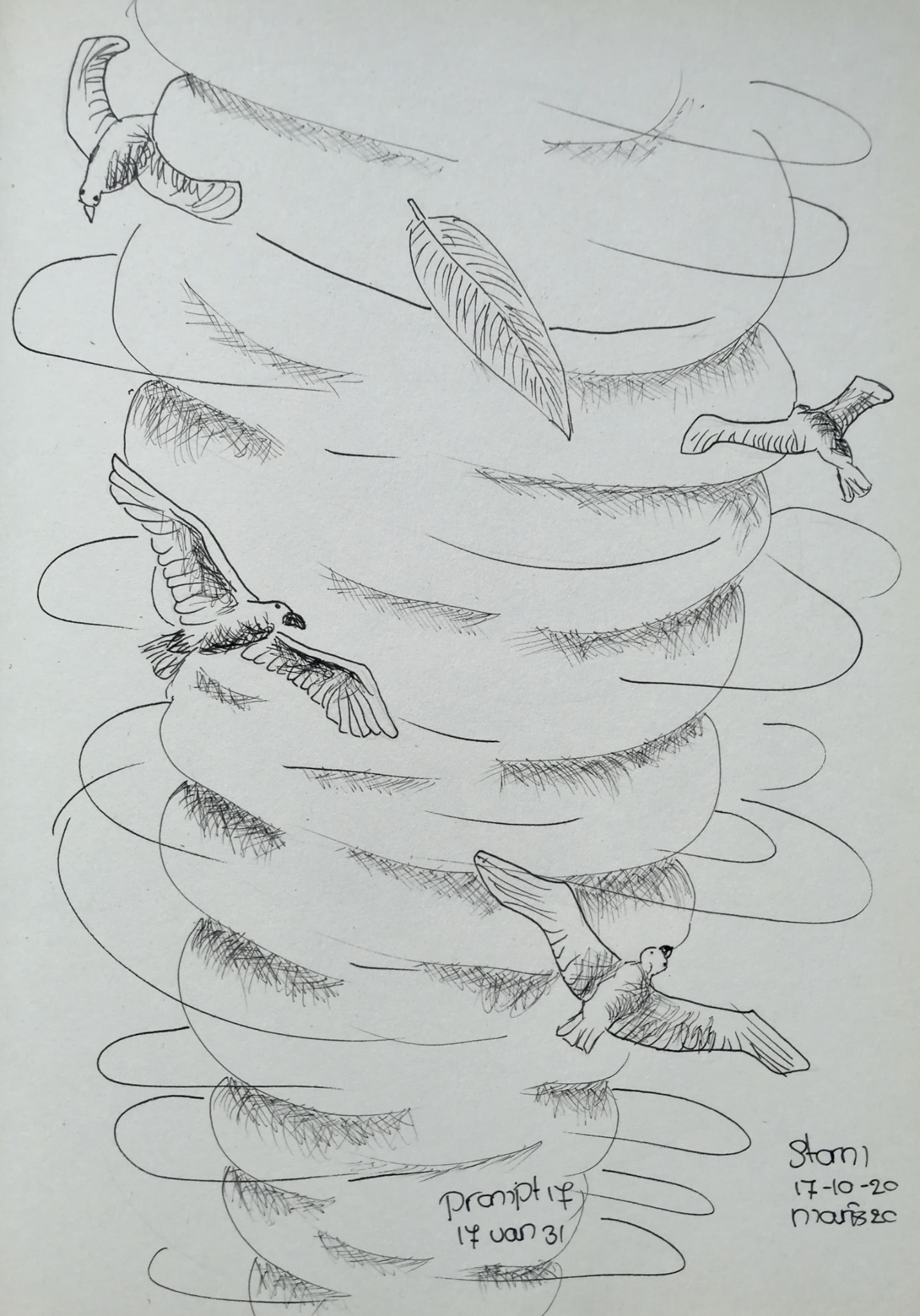 Hoe teken je een storm? Best een lastige vraag. Ik moest aan de film 'twister' denken. Een wervelstorm. Er moesten ook dieren in. Vogels spelen vaak met de turbulentie in de lucht. Dus er kwamen vogels bij de wervelstorm
