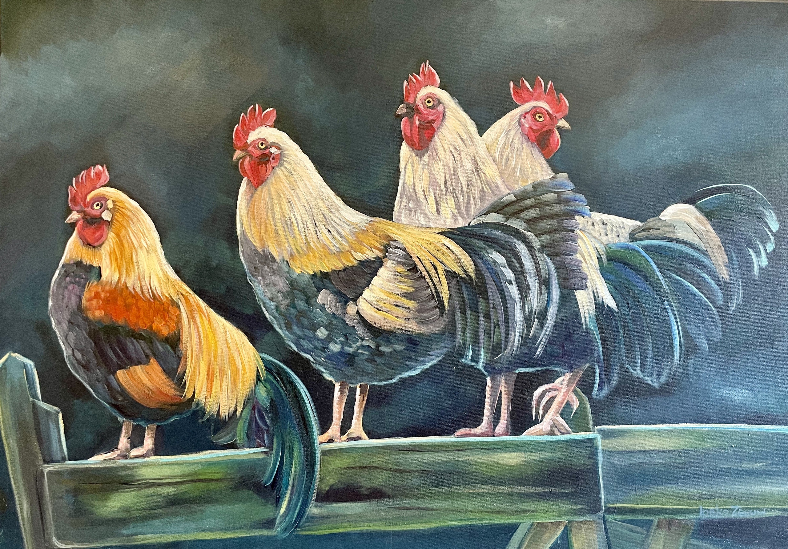 Hanen op een hek