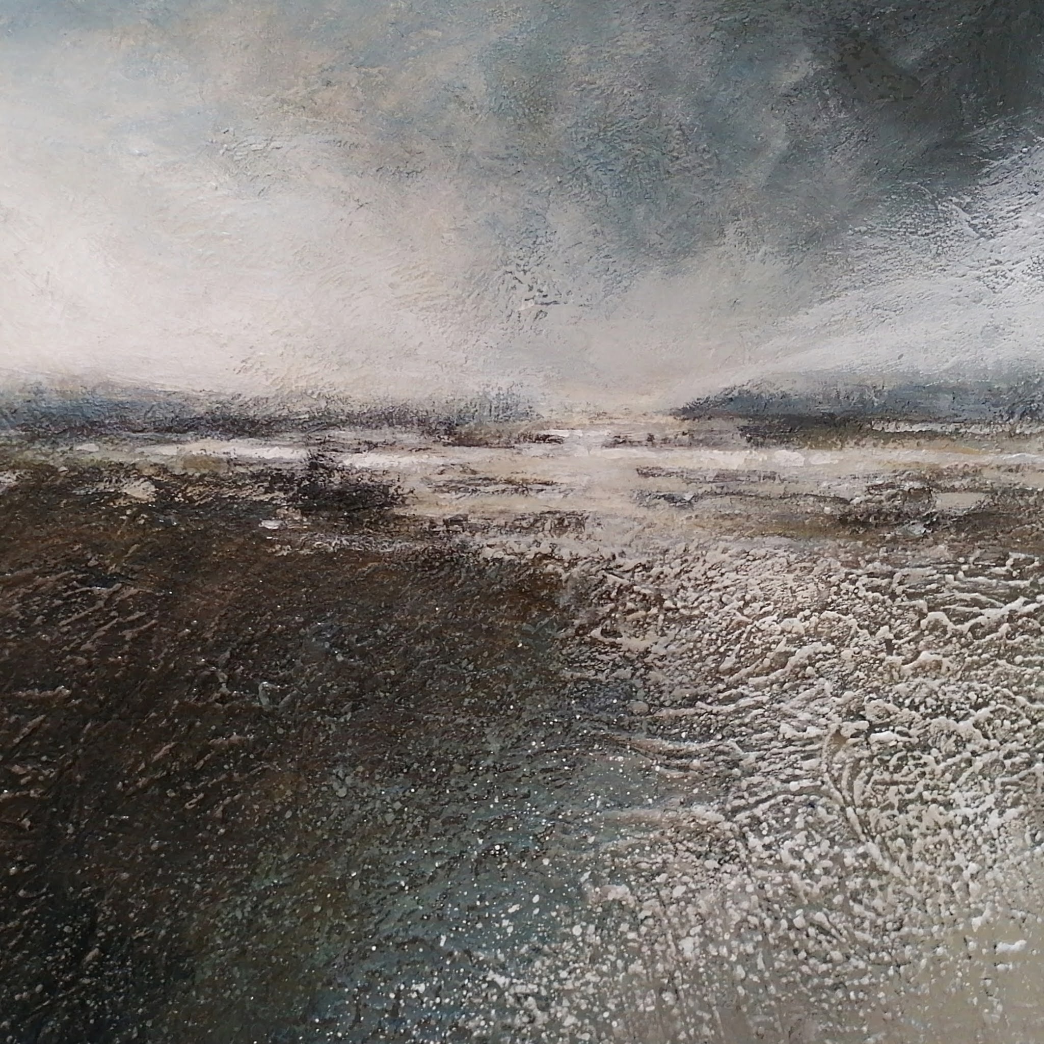 Slikken van Flakkee. Landschap in structuur op paneel in witte baklijst.