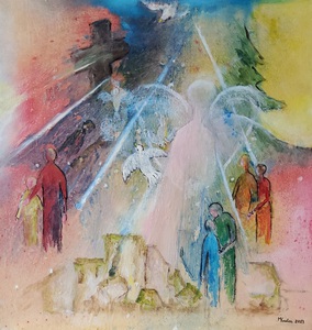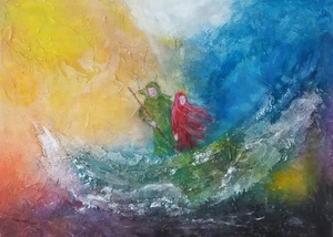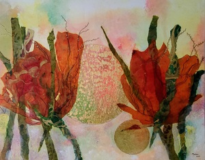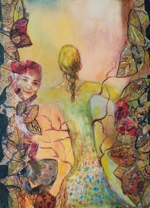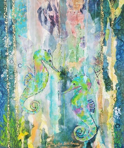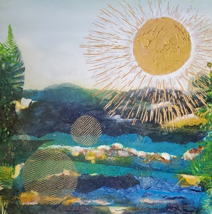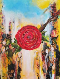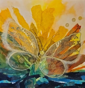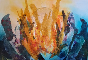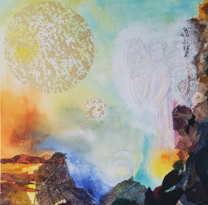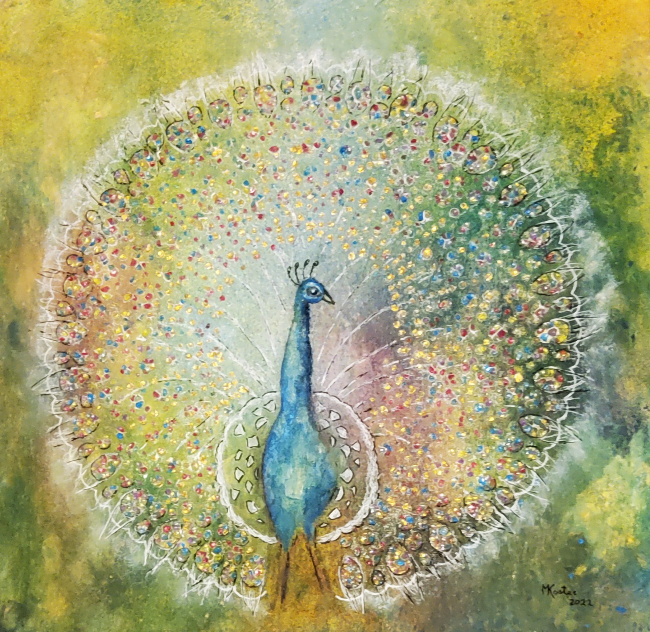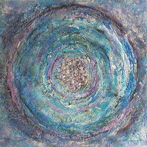 Gemaakt met acrylverf en facettenlak op houten paneel. Het werk heeft structuur. Parelmoer- en metallicverfjes. Het werk is gevernist. Prijs is compleet met witte baklijst.