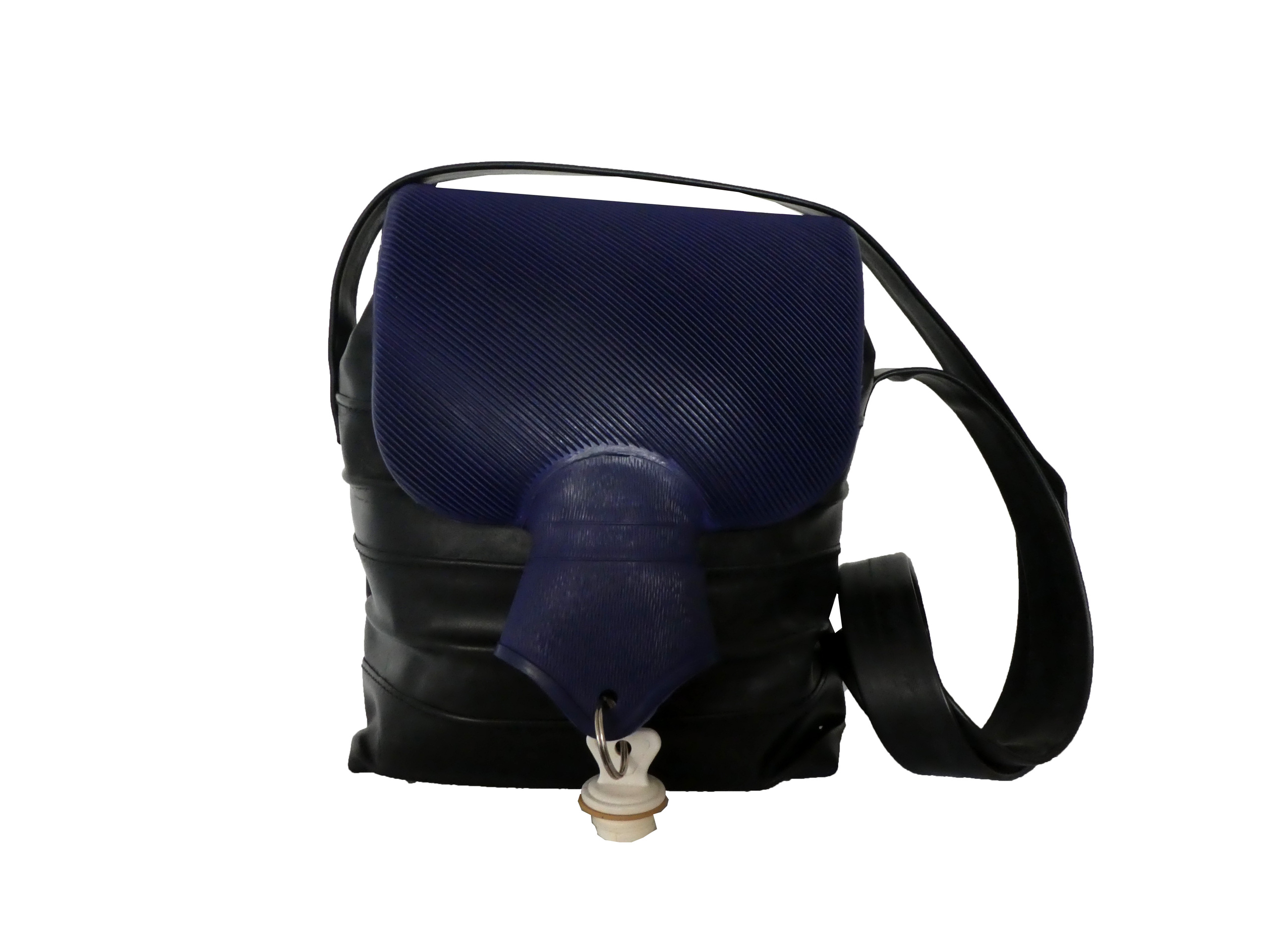 Geïnspireerd door de regen, water en rubber; een douchegordijn met waterdruppels als voering en de helft van een ouderwetse donkerblauwe warmwaterkruik fungeert als klep van de tas. De tas zelf is gemaakt van hergebruikte fietsbinnenbanden en heeft een binnenvak met rits. Achter aan de buitenkant zit een tweede ritsvak. De tas sluit met een koord door zeilringen en een haak-oog sluiting. De schouderband is van verstevigd fietsbinnenband met een lengte van 132 cm en niet verstelbaar. Desgewenst pas ik deze lengte voor u aan door middel van een kleine aanpassing. “Om de wereld een beetje mooier te kleuren”