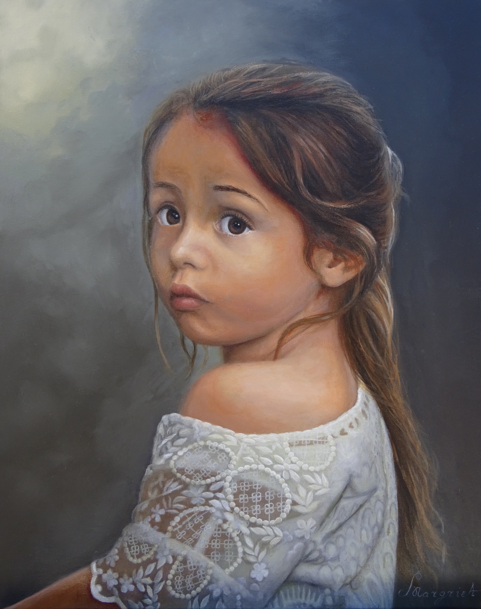 Kinderportret geschilderd met olieverf op traditionele wijze. Opgebouwd met vele laagjes tot een levensecht resultaat.