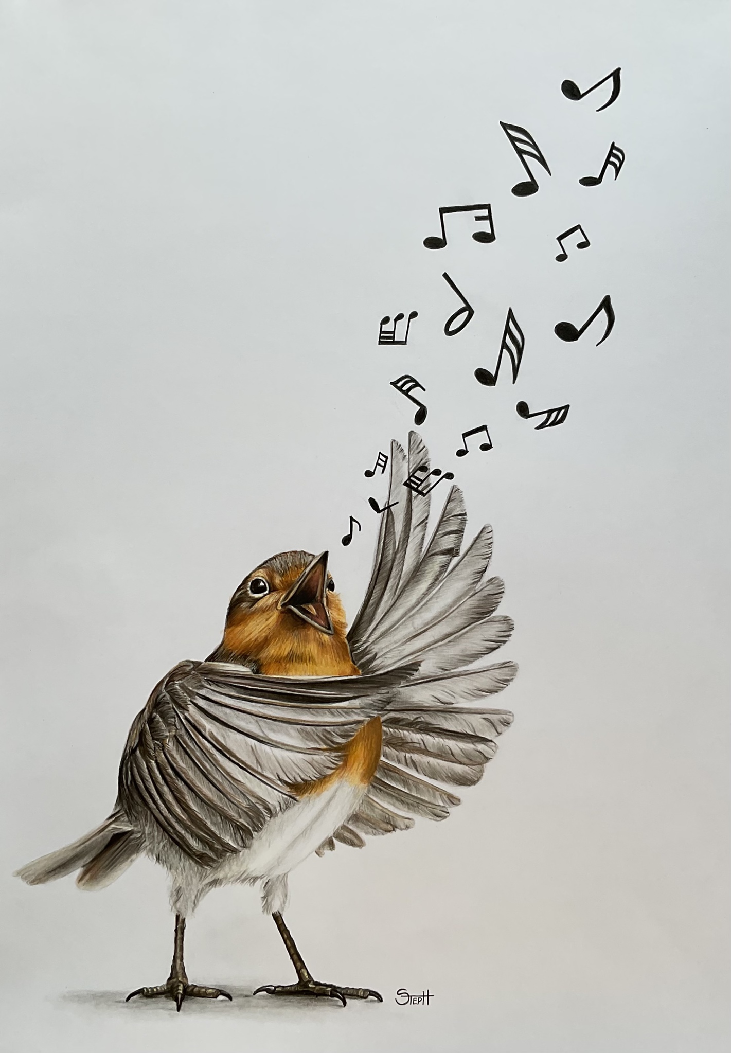 Vogel Roodborstje Muziek Muzieknoten Realisme Tekening Kleurpotloden