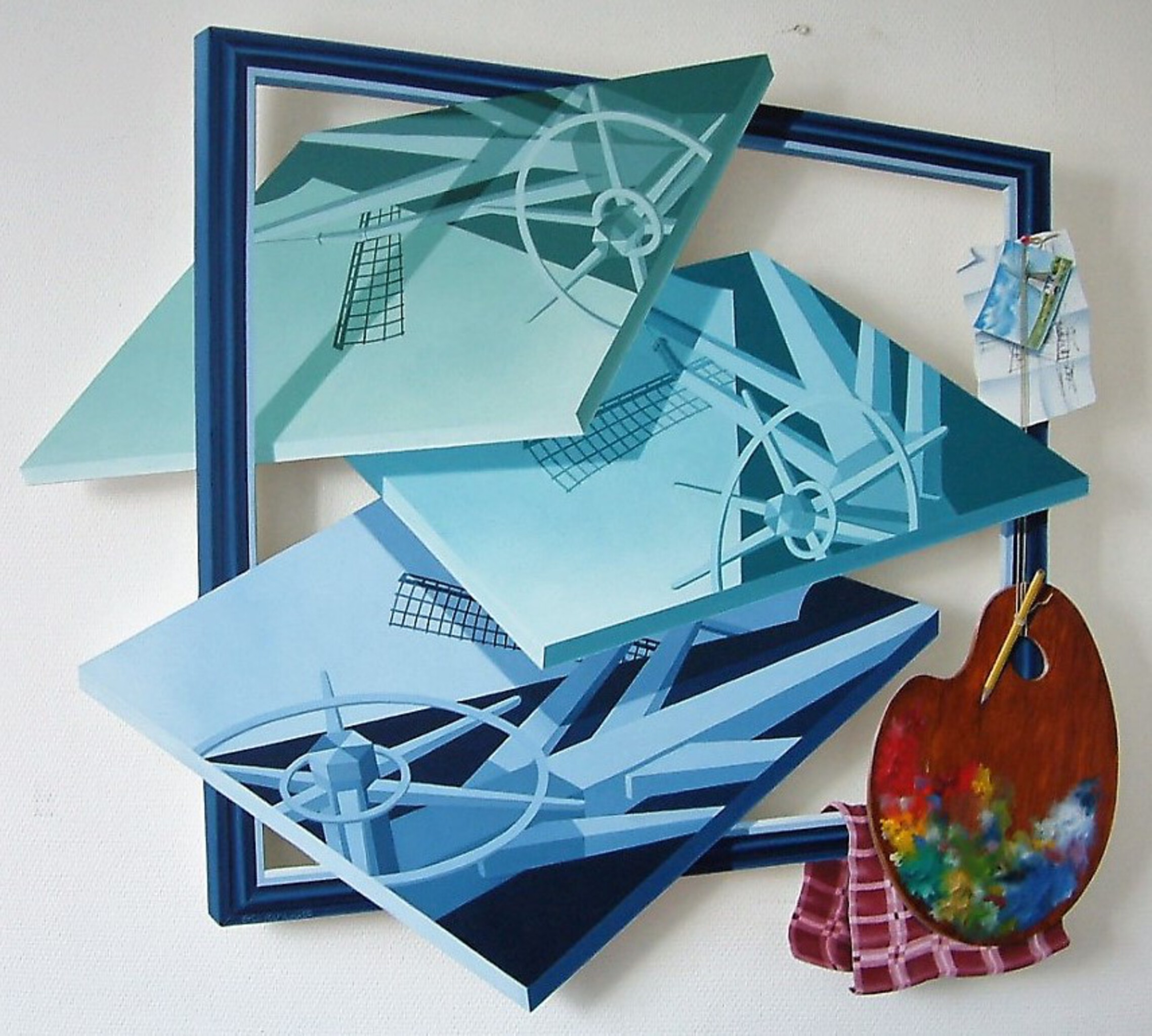 Eric Kerkvliet schildert met olieverf uiterst gedetailleerd voorstellingen op iets verhoogd paneel waardoor bij juiste belichting een Trompe-l’oeil-achtig effect ontstaat.