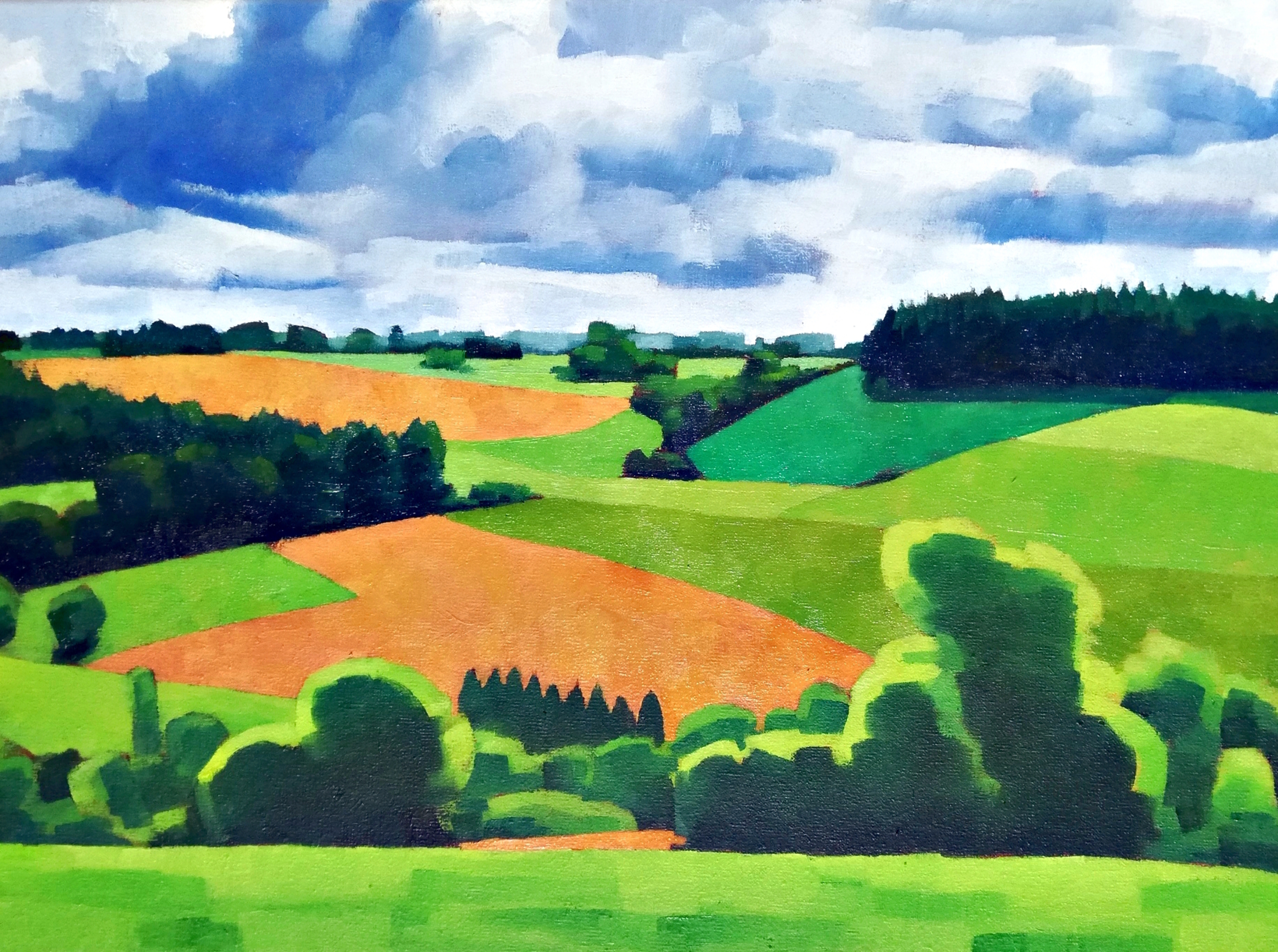 Vorig jaar heb ik een serie schilderijen gemaakt van de Eifel. Wat me aanspreekt zijn alle verschillende tinten groen en de lappendeken aan gekleurde velden die je daar in de lente aantreft. De Eifel is een bijna abstract landschap met verschillende overzichtelijke lagen en glooiende lijnen dat zich uitstekend leent tot stylering.