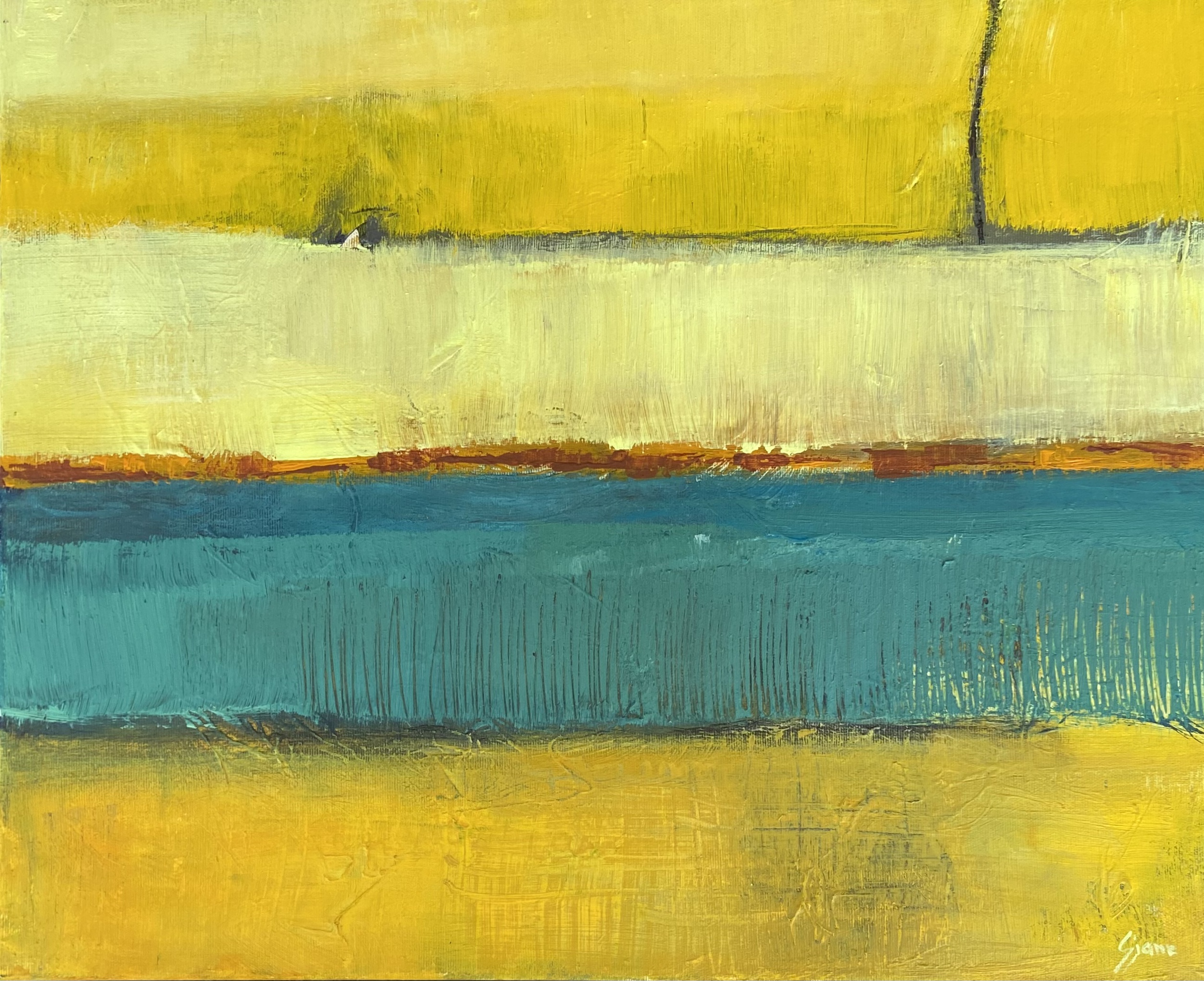 Het landschap is mijn grootste inspiratiebron. In de zomer heb ik veel buiten geschilderd. Mijn landschappen zijn kleurrijk en sterk geabstraheerd. Op het moment zijn mijn landschappen abstract.