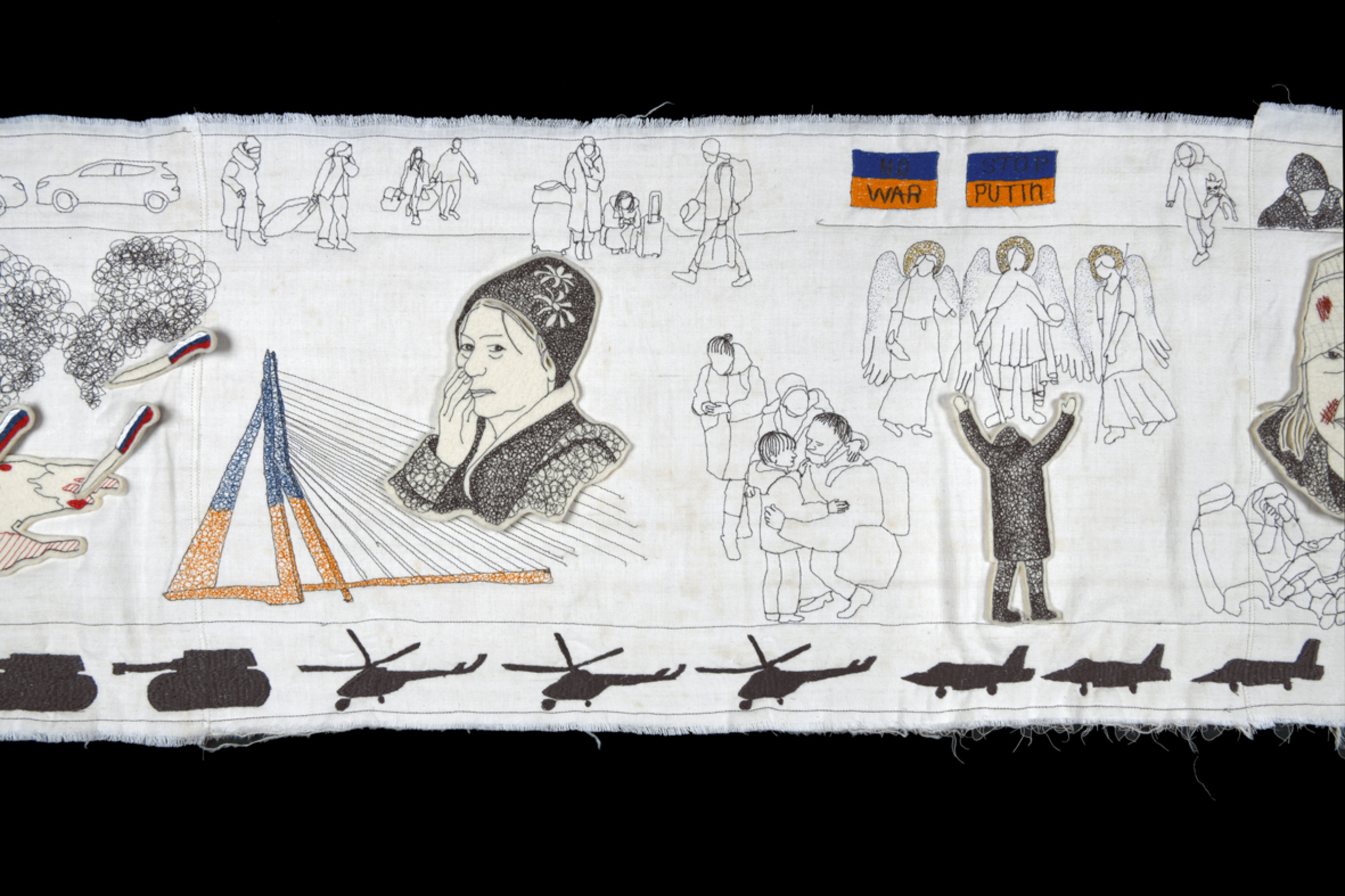Het tapijt is een lang werk waarbij de oorlog tussen Rusland en Oekraine wordt vastgelegd in beeldtaal. Irma tekent met de naaimachine.