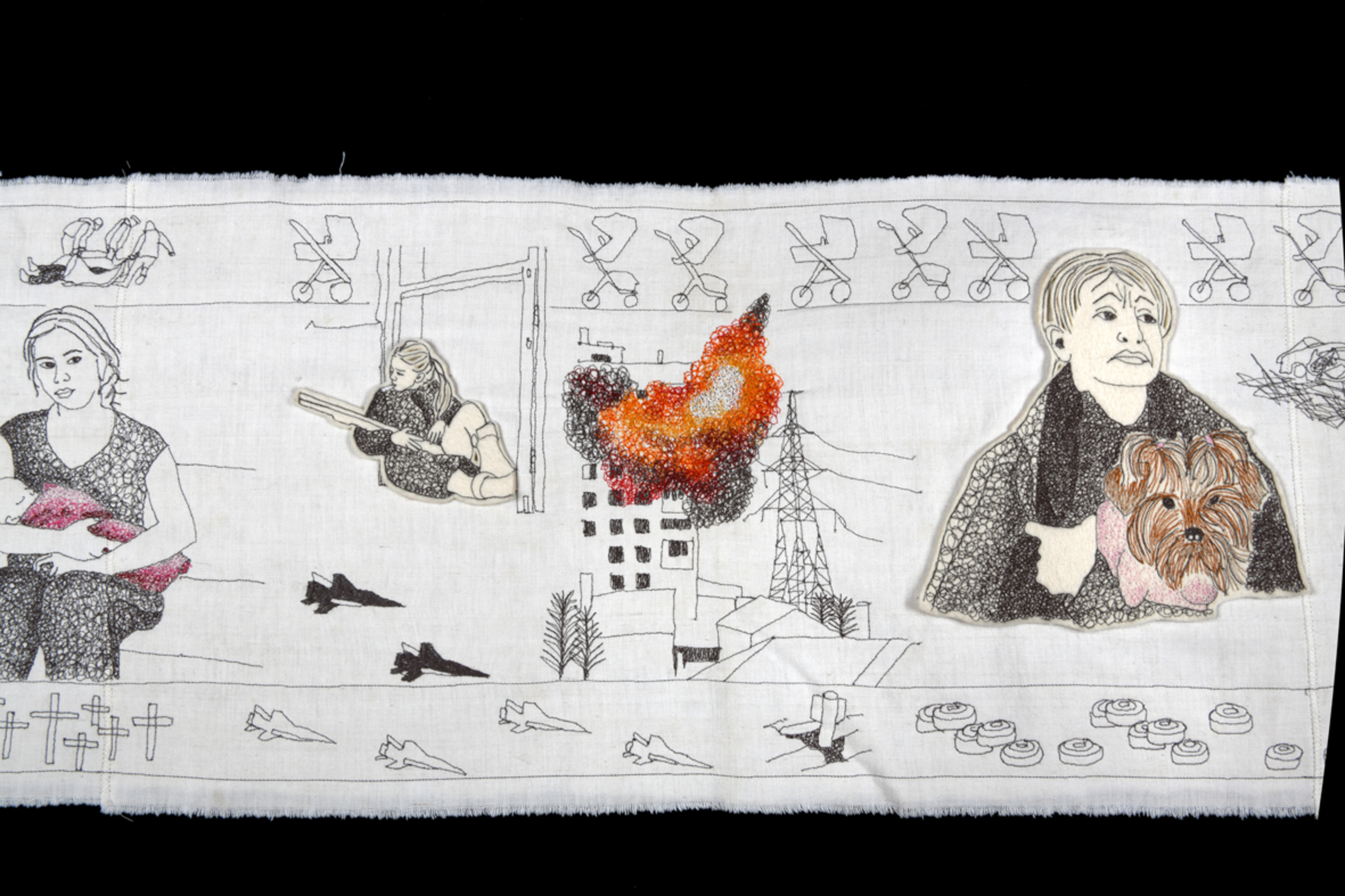 Het tapijt is een lang werk waarbij de oorlog tussen Rusland en Oekraine wordt vastgelegd in beeldtaal. Irma tekent met de naaimachine.