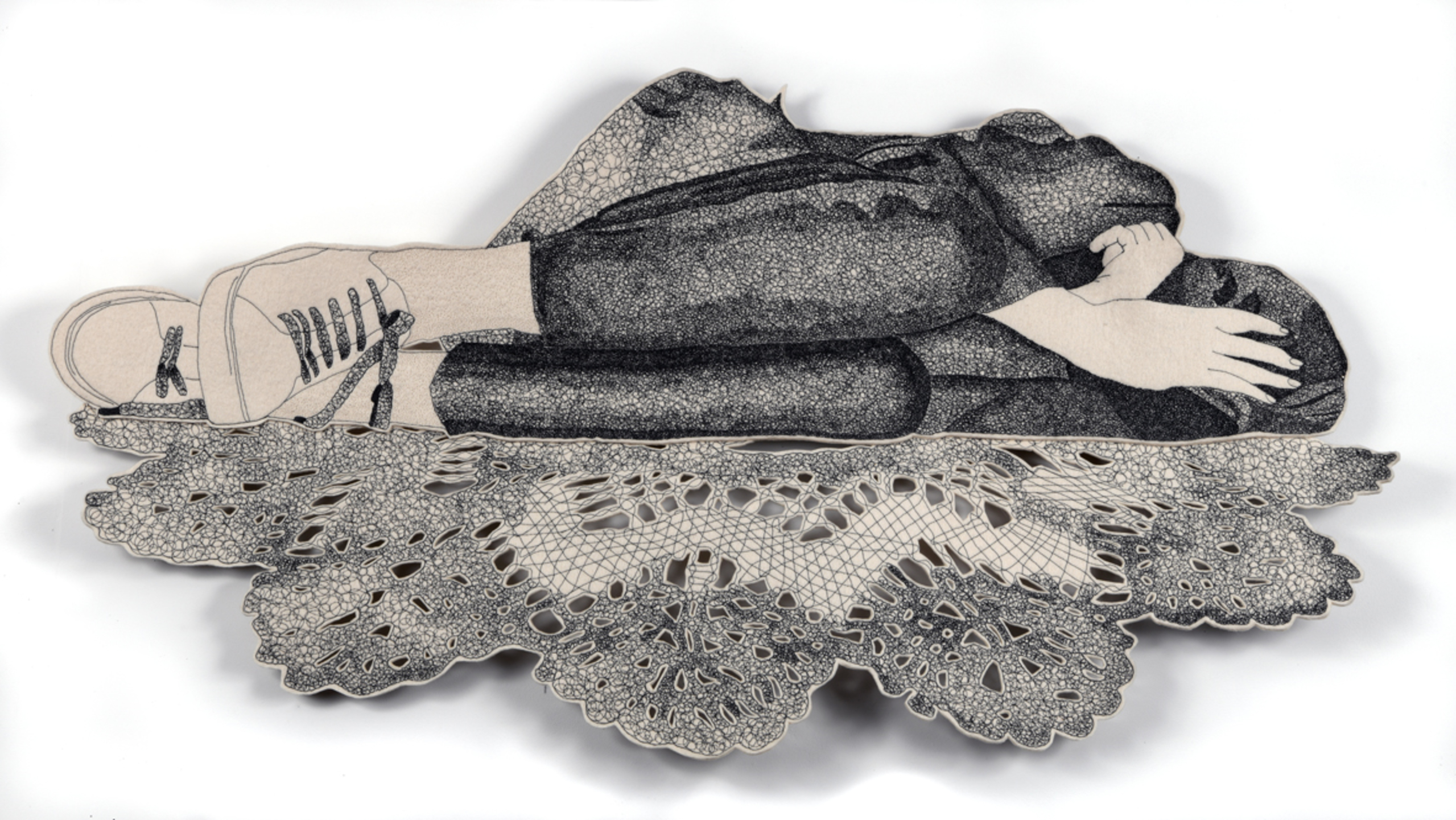 De Verstotenen: Honderd miljoen mensen zijn op dit moment op de vlucht. De wereld staat in vuur en vlam. Hierdoor zijn er heel veel individuen, zowel vluchtelingen als daklozen, verstoken van een veilige plek waar zij zich thuis mogen en kunnen voelen. Irma zou al deze mensen zo’n veilige plek willen bieden. Zoals haar huis een cocon is waarin zij zich kan terugtrekken en waar zij zich veilig voelt. Irma vroeg zich af: ‘Hoe kan ik toch een beetje troost bieden en een klein plekje waar iemand zich veilig voelt ook al is het in de open lucht.’ Zij besloot een antimakassar als uitgangspunt te nemen. Deze heeft zij sterk vergroot en neergelegd op straat. De thuisloze kan hierop plaatsnemen. Het is op dat moment zijn thuis. Hopelijk geeft deze plek allereerst een gevoel van herkenning en, al is het voor heel even, een gevoel van thuiskomen. (Een antimakassar is een kleedje, vaak van kant, dat op de bovenkant van een stoel of bank gelegd wordt om deze te beschermen tegen oliën en gels. Overal in de wereld zie je in veel huishoudens deze kleedjes opduiken.)