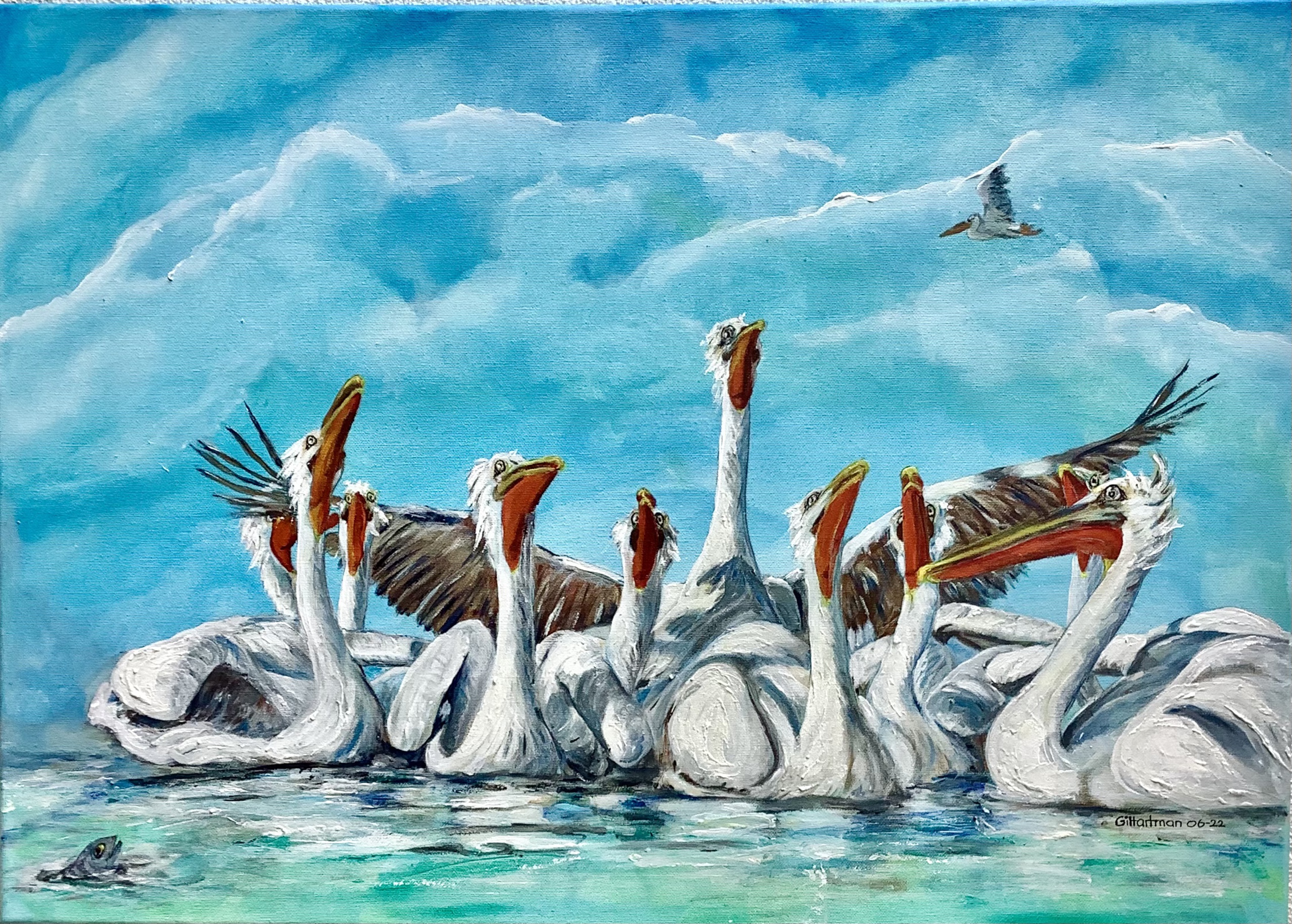 Een groep pelikanen kijkt naar een een wegvliegende soortgenoot. Een vis kijkt geïnteresseerd toe. De pelikanen hebben niet in de gaten dat er een smakelijk hapje rondzwemt.