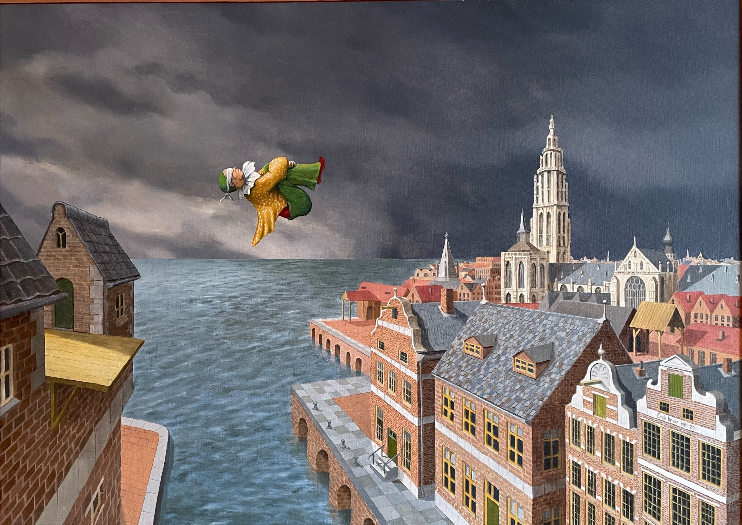 Magisch realistisch. Na 40 jaar schilderde ik dit nog eens. Nu met een stad waar het zonlicht op valt en op de achtergrond een opkomend onweer.