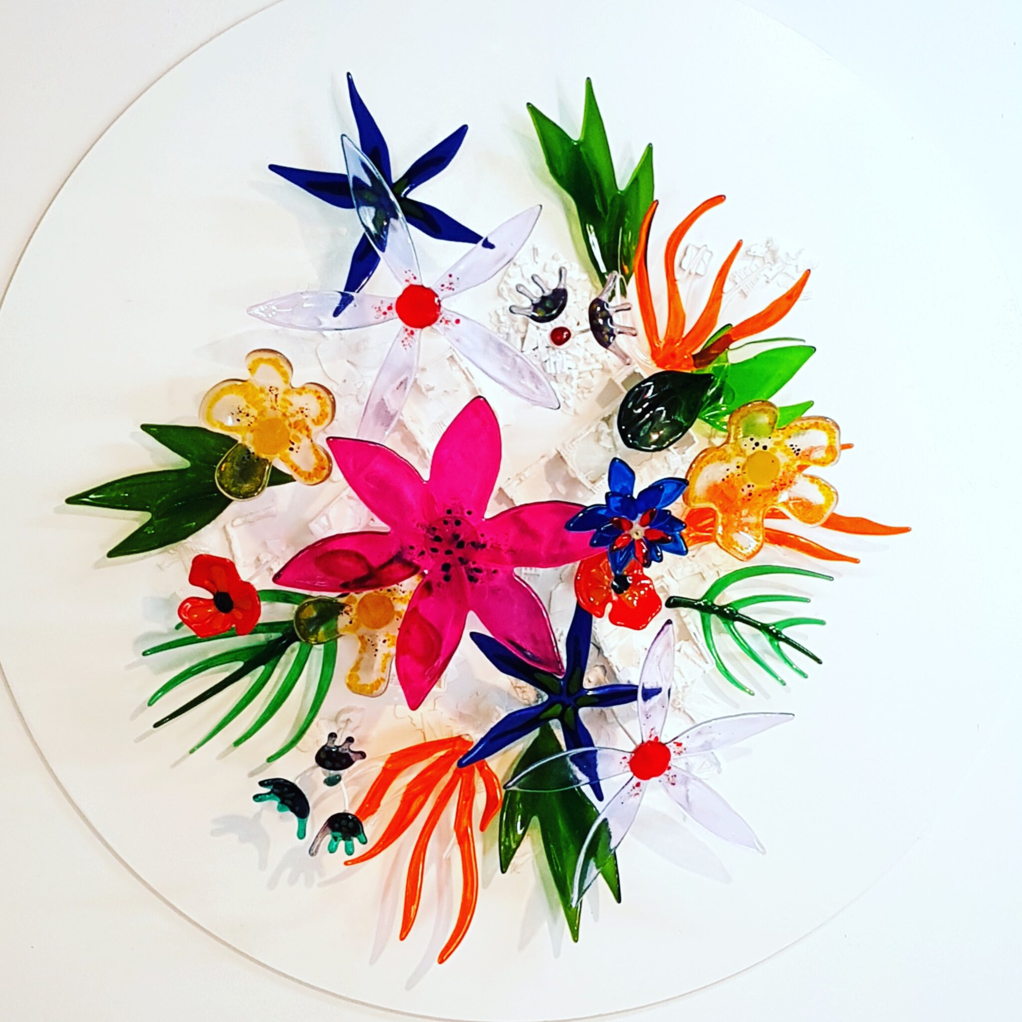 Wandobject gemaakt voor Het Feest van de Geest 2022. Glasfusie en 3D print. Achter de glazen bloemen liggen verwoeste gebouwen. Op de puinhopen van de verwoeste steden herneemt uiteindelijk de natuur zijn positie in al zijn pracht.