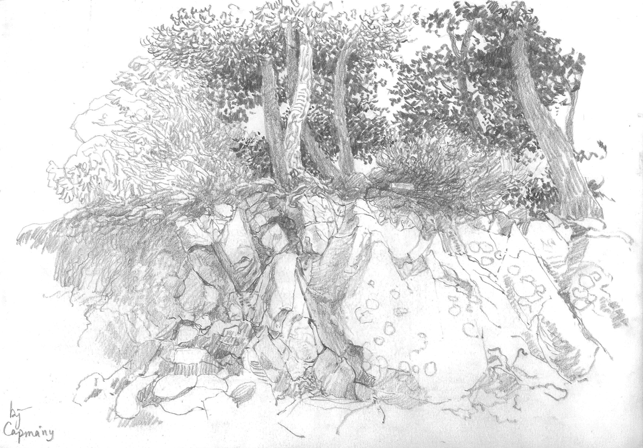 Een walkant in het landschap met rotsen, Een studie uit mijn Spaanse schetsboek : Zie ook : https://www.benrikken.nl/tekeningen--divers--drawings-diverse