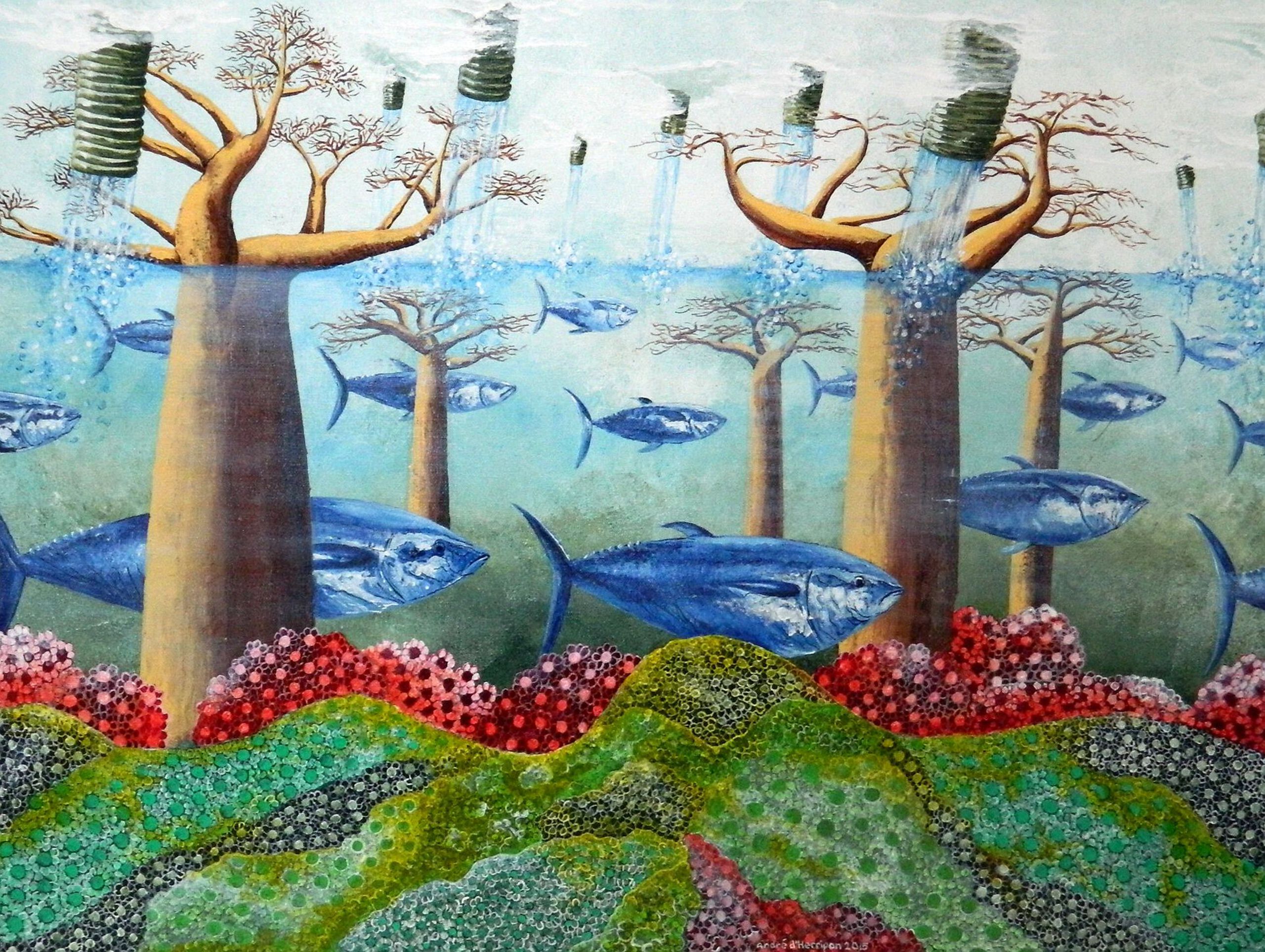 In een surrealistische stijl probeer ik de kijker te bewegen zich meer bewust te worden over wat zich in de wereld afspeelt, met name over de natuur.