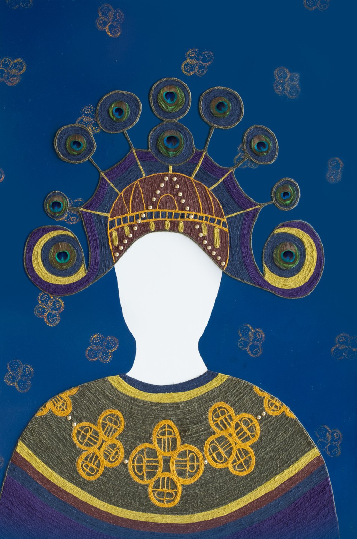 Figuratief Geel Blauw Groen Portret Bruin Maria Veren Pauw Pauwenveer Veer Hoofdtooi Callas Touwportret