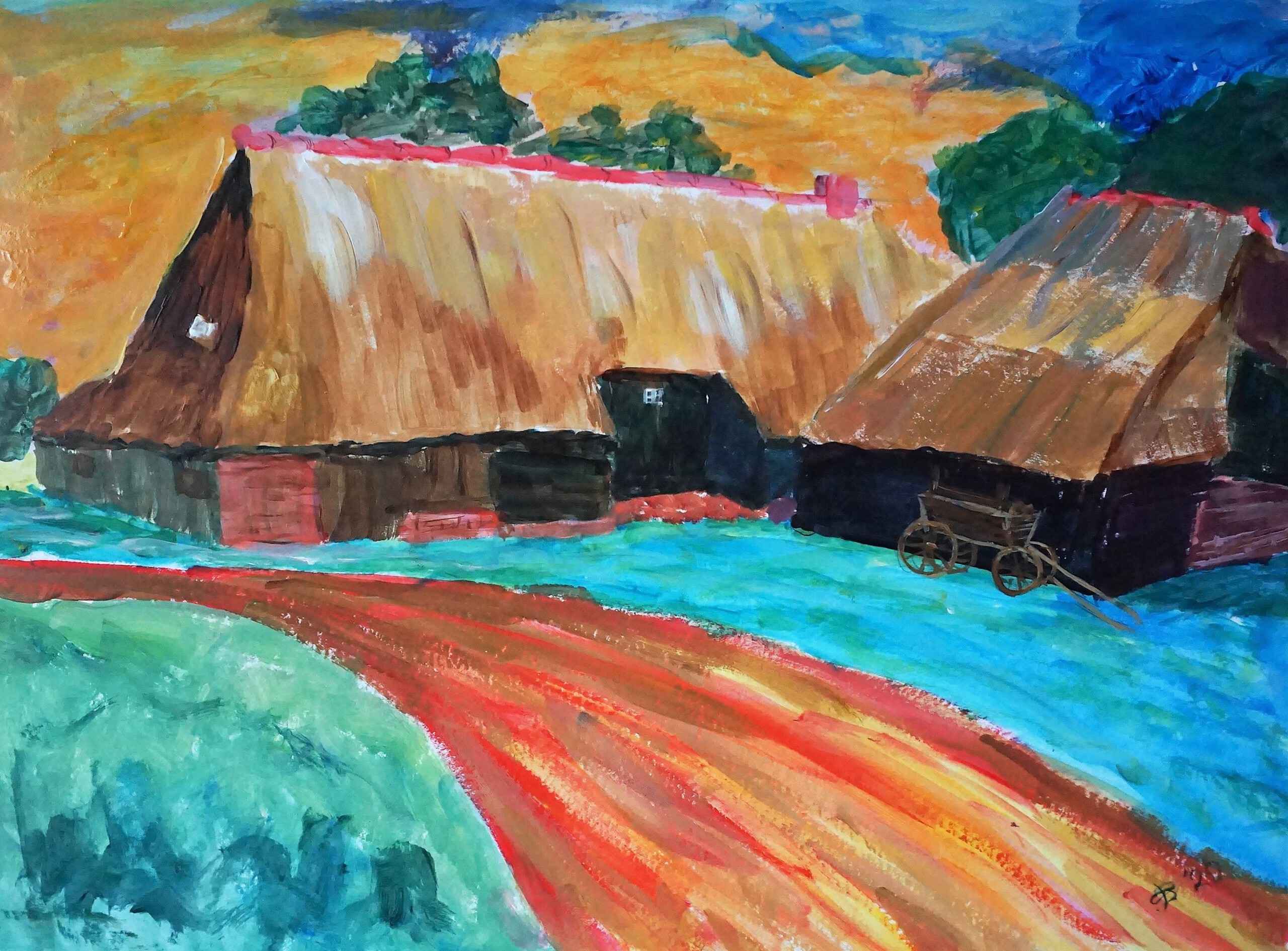 Het dorpje Darp, naar een zwart-wit-foto uit 1949, van Sam Dice. Darp, is ook gewoon de Drentse vertaling van dorp. Ik ben zelf geboren in 1949. Mijn vader heeft mij als jochie van 8 -> 12, regelmatig op een zondagochtend diverse dorpjes laten zien, Hij wees me op de mooie dingen, de natuur en zei me: >>Let op... langzamerhand worden de boerderijen lelijker, verbouwd door mensen zonder inzicht en smaak. En hij hoopte maar dat de Drentse houtwallen in tact bleven. Enkele van zijn geliefde visplekken ging men al ruïneren!! (Klenckerstroom) Ik heb het gecheckt. Ik ben van plan om meer oude foto's te verzamelen en schilderen.