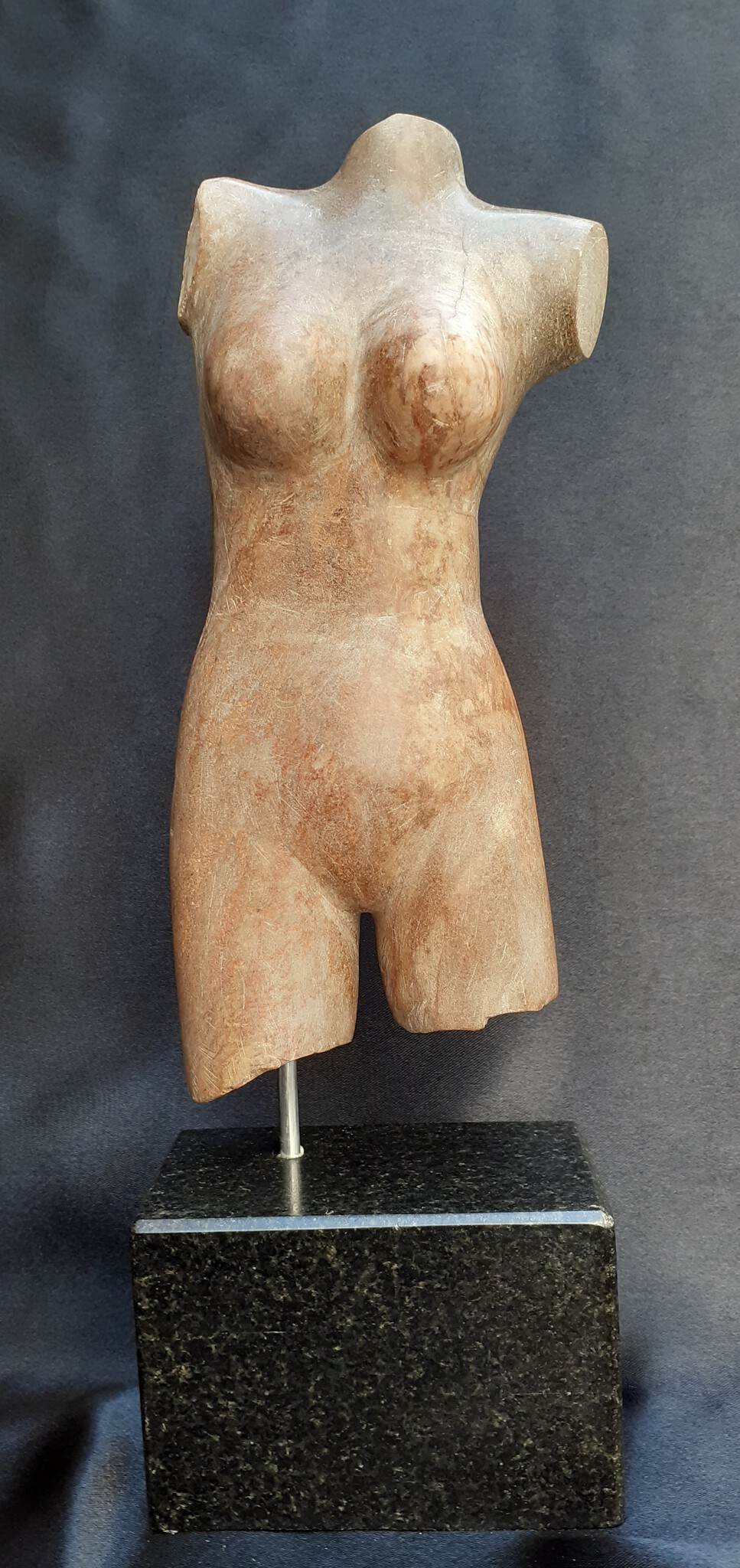 mooie vrouwentorso van een heel speciale kleur speksteen. Hij staat op een zwarte hardstenen sokkel