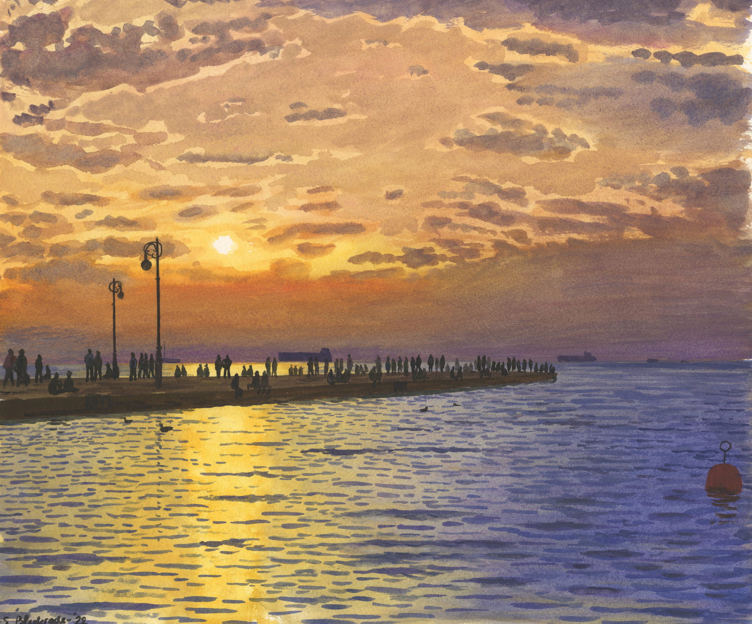 Zee Mensen Rood Geel Yellow Sunset Zonsondergang Water Aquarel Red Realisme Realism Watercolor Zomer Summer People Sea Italië Italy