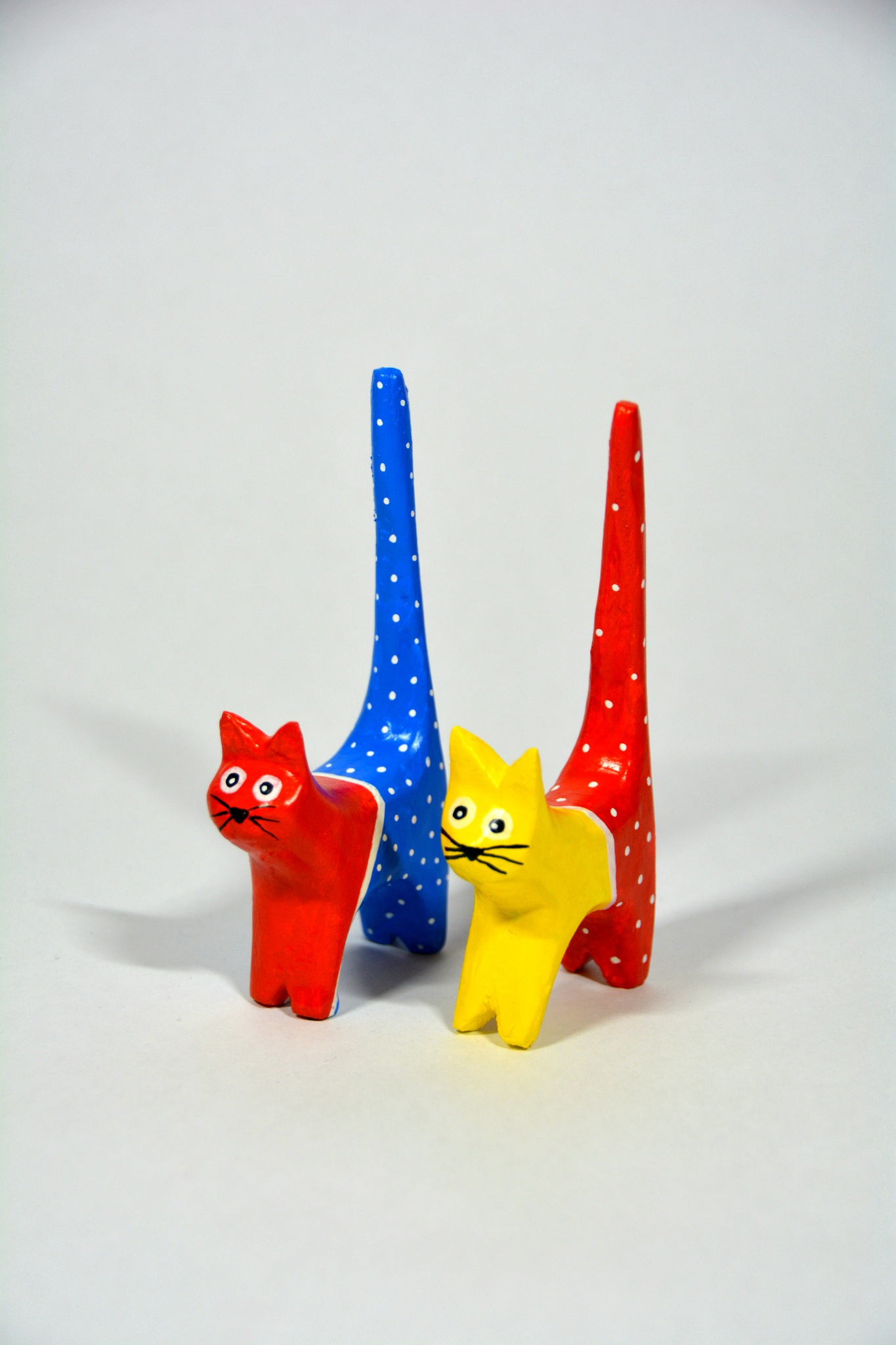 Modern en minimalistisch beschilderde katten met geometrische vormen en felle kleuren. Hier zie je werk uit de serie ‘Beelden met een tweede leven’. Dit zijn oude, houten beelden die ik heb gerepareerd en moderne, veelal kleurrijke beschilderingen heb gegeven. Hierdoor verdwijnen de versleten beelden niet in de afvalbak, maar kunnen ze een tweede leven leiden. Zo is ieder beeld duurzaam en uniek! Afmetingen zijn per stuk.