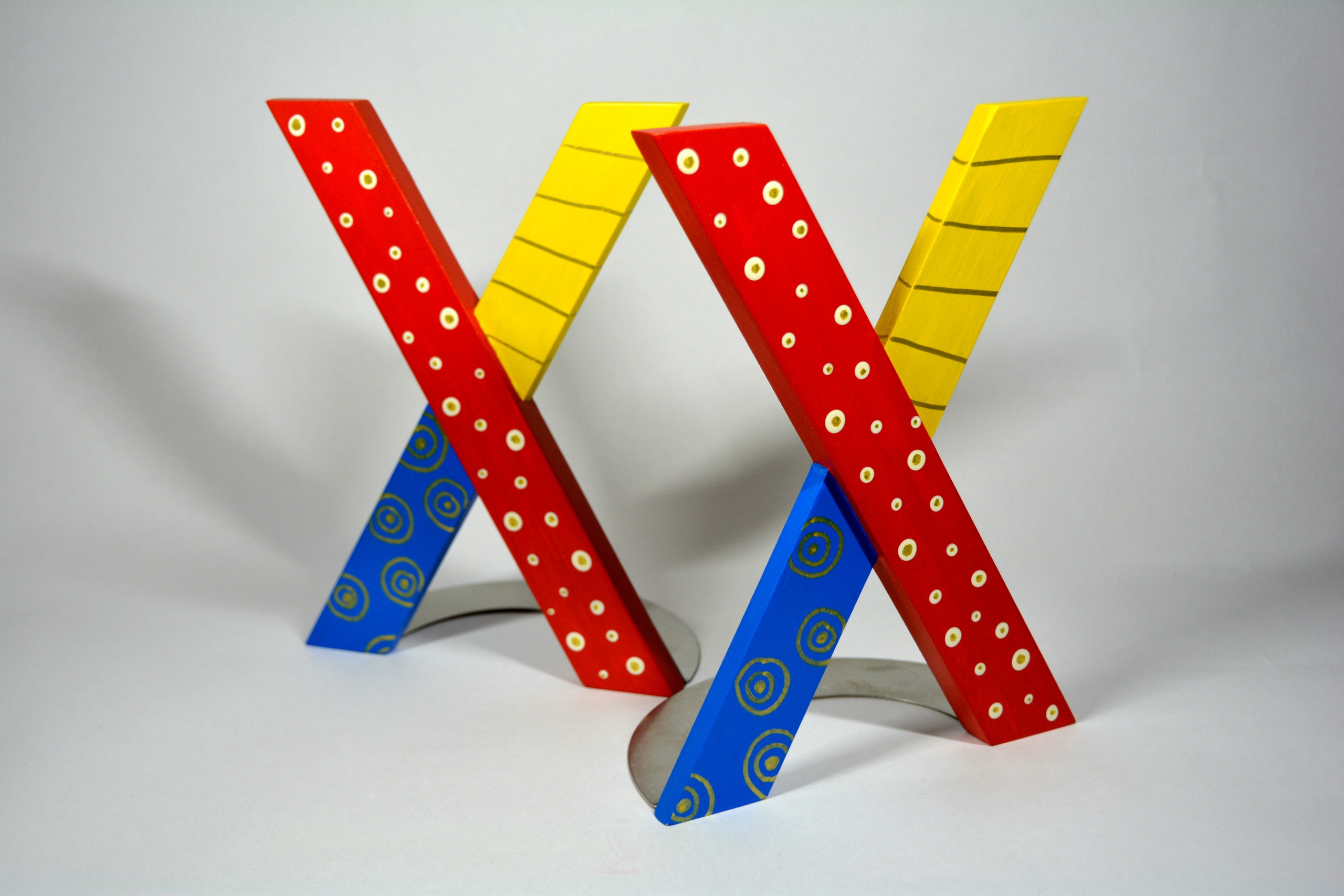 Modern beschilderde boekensteunen met geometrische vormen en felle kleuren. Hier zie je werk uit de serie ‘Beelden met een tweede leven’. Dit zijn oude, houten beelden die ik heb gerepareerd en moderne, veelal kleurrijke beschilderingen heb gegeven. Hierdoor verdwijnen de versleten beelden niet in de afvalbak, maar kunnen ze een tweede leven leiden. Zo is ieder beeld duurzaam en uniek! Afmetingen zijn per stuk.