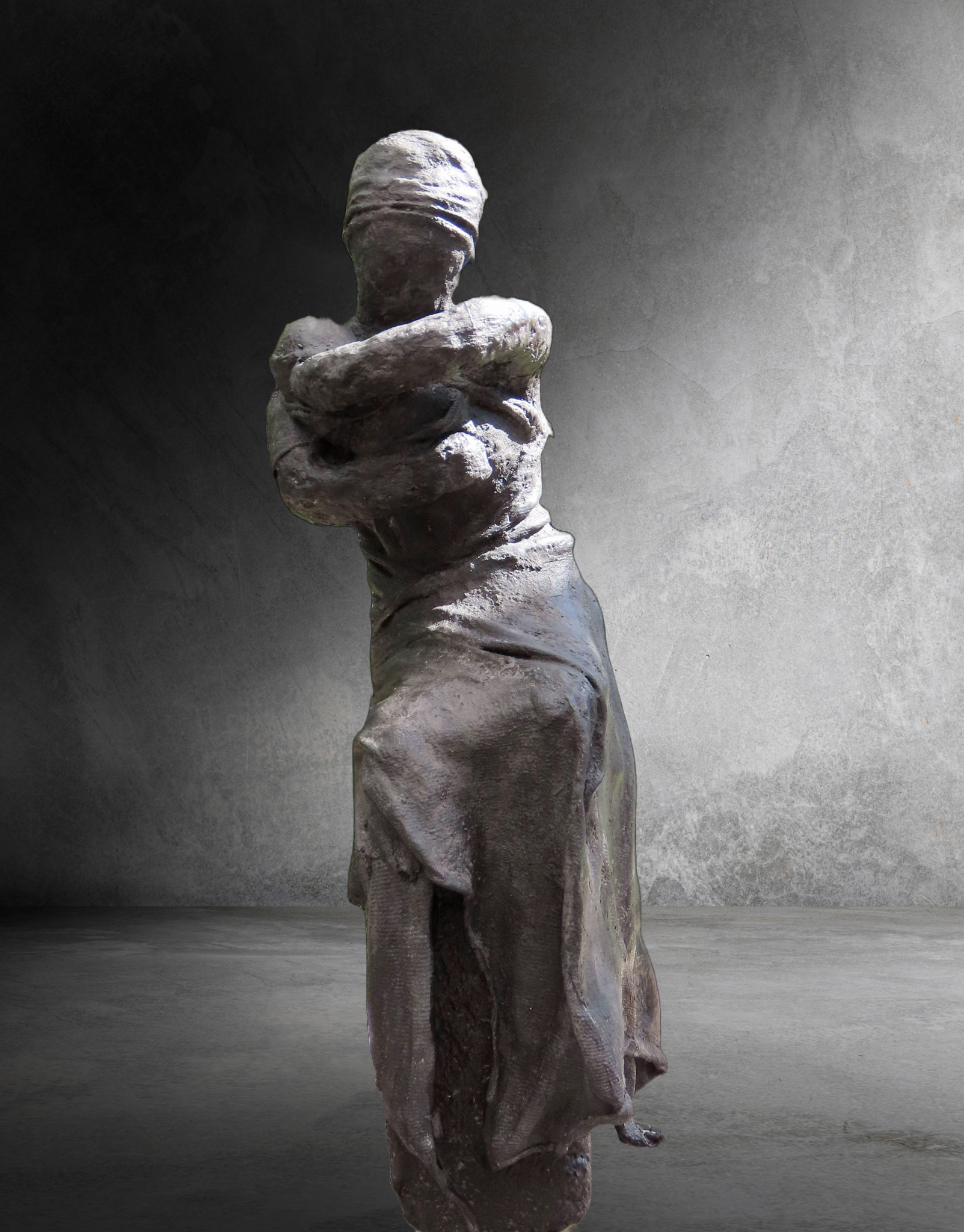 - VERKOCHT - Het koesteren van het moment... van het leven... het koesteren van de liefde en de herinneringen. Beeld van klei en steen, afgewerkt met textiel, paverpol en paversand.