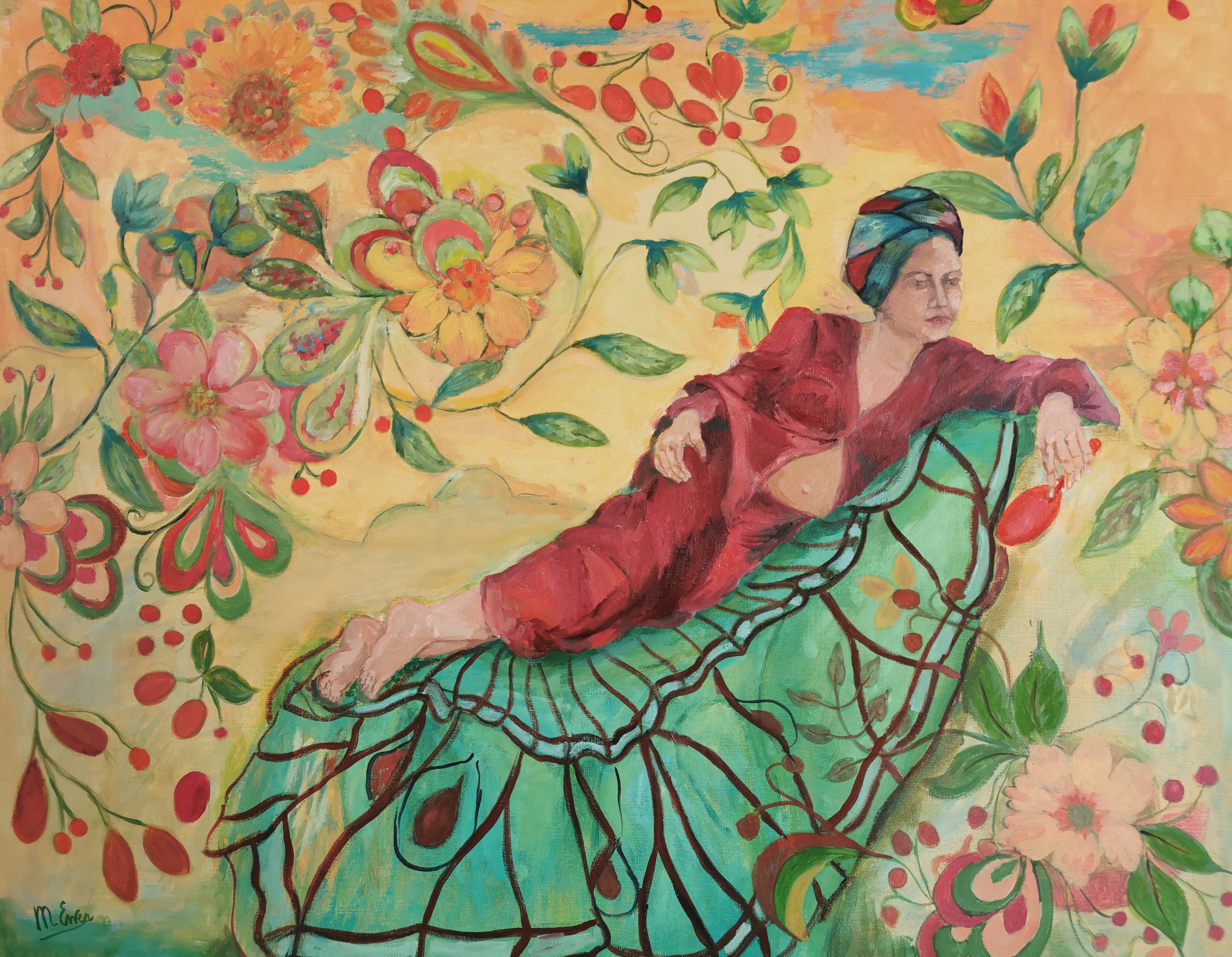 Een vrouw met tulband liggend op haar vlinderbed in een tuin vol bloemen. olieverf op linnen 1.20 x 1.00 m