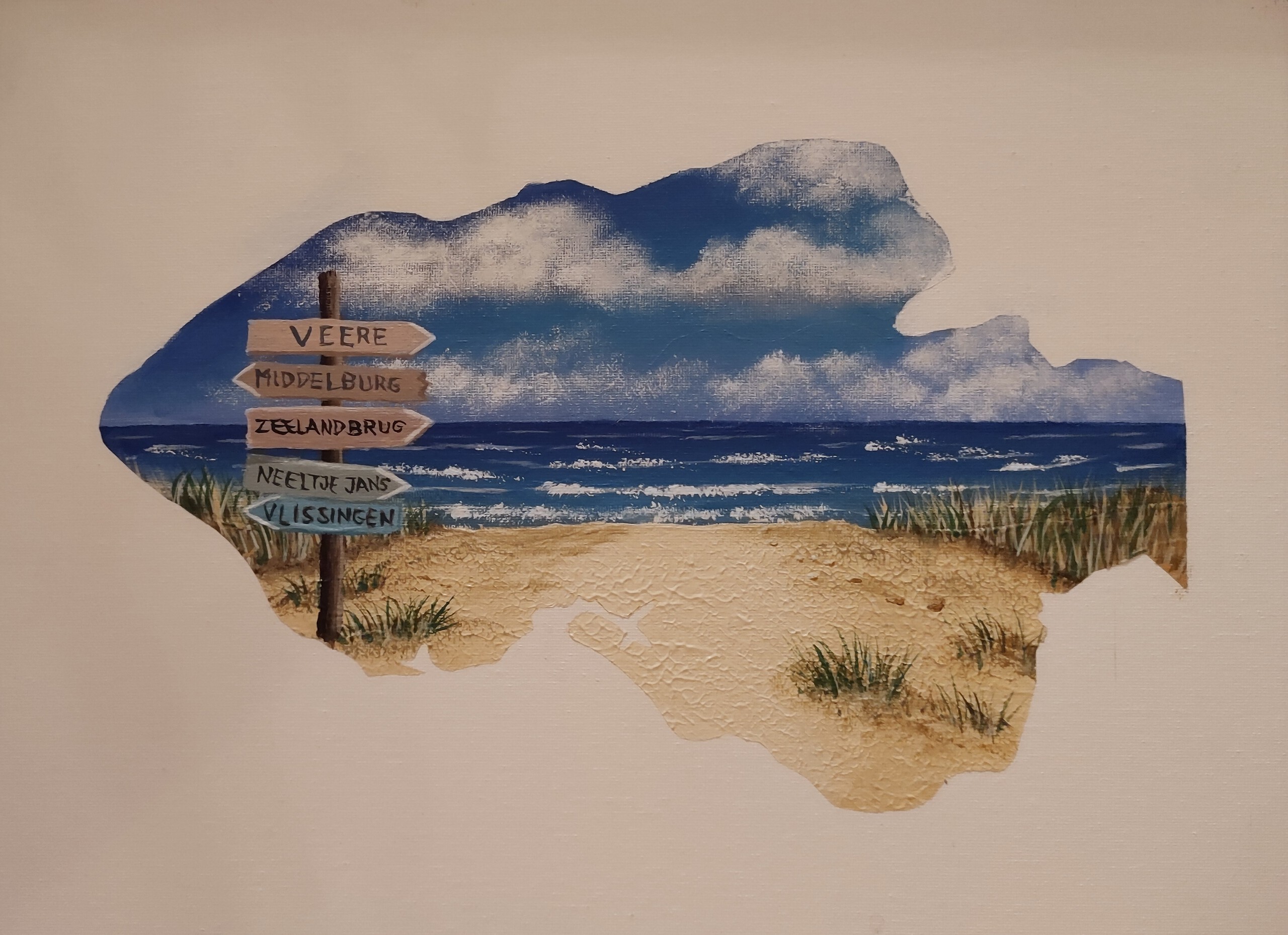 Op dit schilderij zie je de contouren van Walcheren, Noord-Beveland en Zuid-Beveland. Op de wegwijzer bordjes staat: VEERE MIDDELBURG ZEELANDBRUG NEELTJE JANS VLISSINGEN