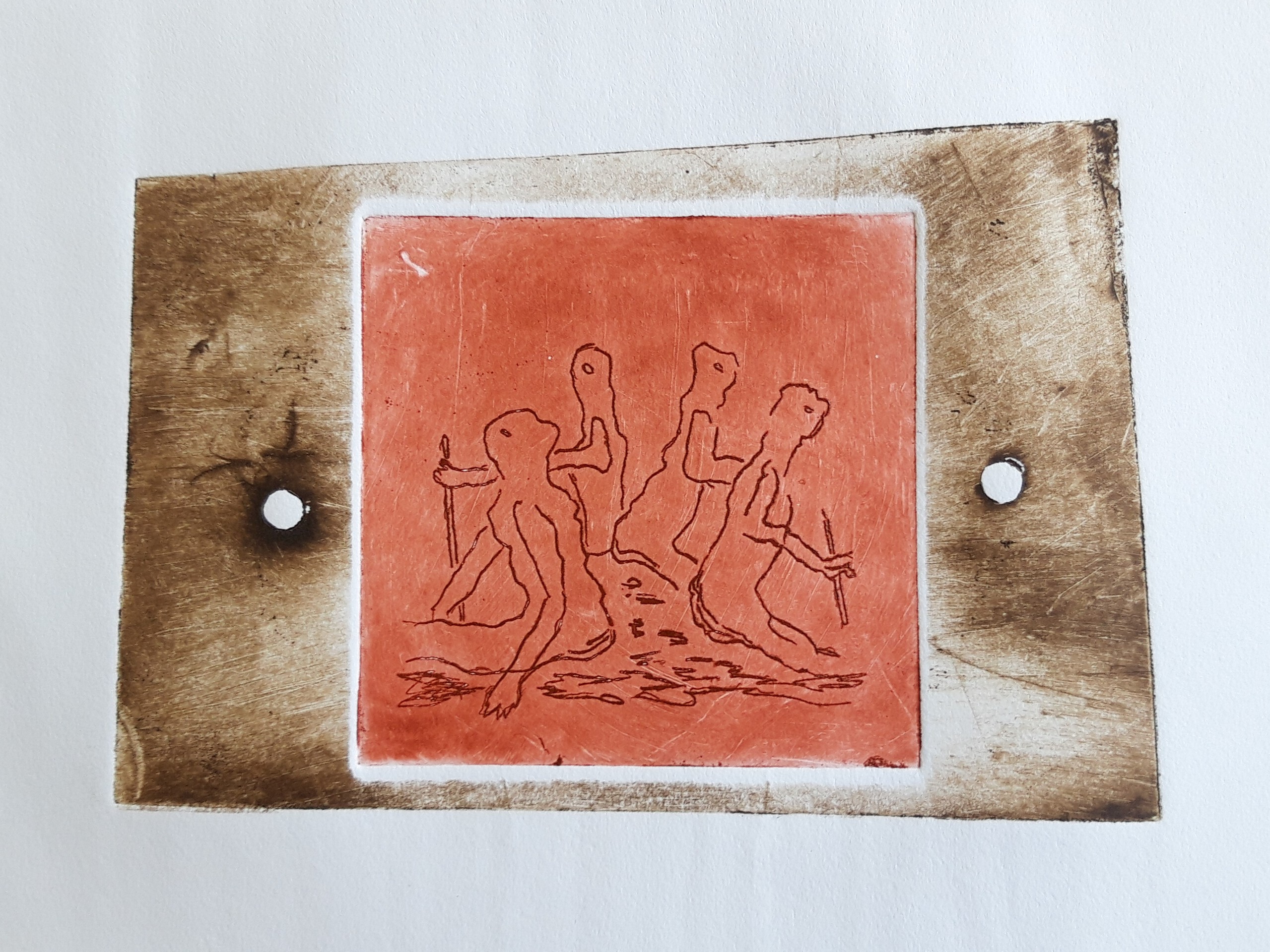 "Vroeger, wanneer mensen elkaar ontmoetten / kwam er een raadpleging. // In de huidige tijd worden mensen afgeleid door digitale apparaten. Dat verklaart een hoop..." Ets, twee platen.