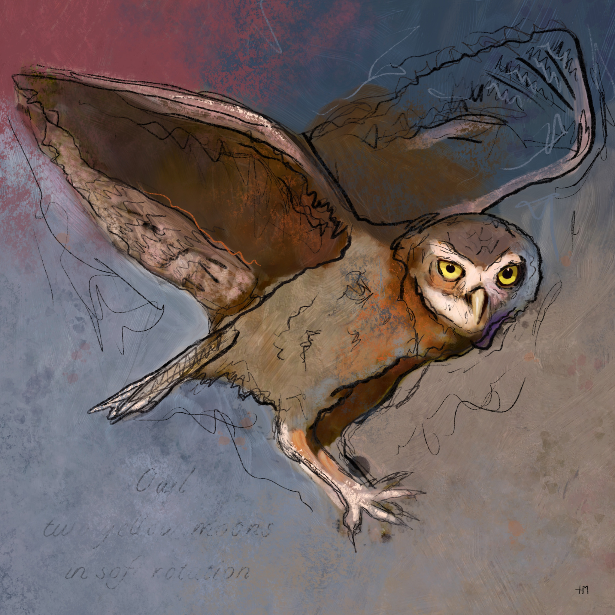 Dit portret van een uil is expressief geschilderd met veel kleur. Ik vond het moeilijk om te bepalen hoe ik de veren vorm zou geven zonder me te verliezen in het schilderen van details. Uiteindelijk heb ik gekozen om geen enkel detail weer te geven en me te concentreren op de buitenste vormen. De ogen kijken je echt aan. De verborgen tekst in het schilderij is: Owl, two yellow moons, in soft rotation. Het origineel is verkocht, maar je kunt een prachtige art-print kopen op papier, canvas en 'heel mooi en modern' op dibond of aluminium. Als je vragen hebt of je wilt een kleine aanpassing in de verhoudingen zodat het net op dat ene plekje past...., aarzel niet om me een mail te sturen.