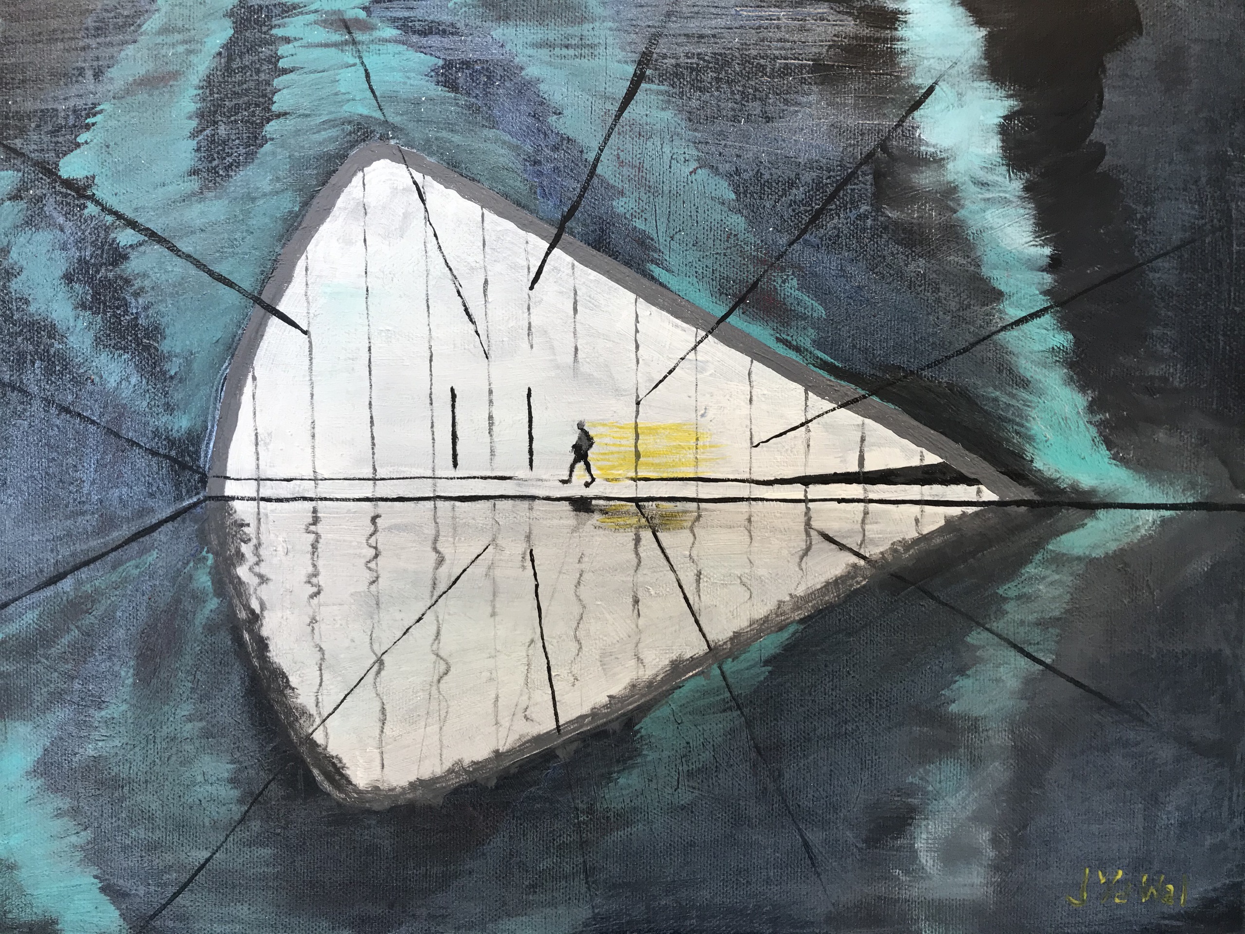 Ik schilder met acryl op doek met soms architectonische achtergronden. Met de menselijke figuren die ik erin aanbreng (geschilderd of als collage) probeer ik een verhaal te vertellen.
