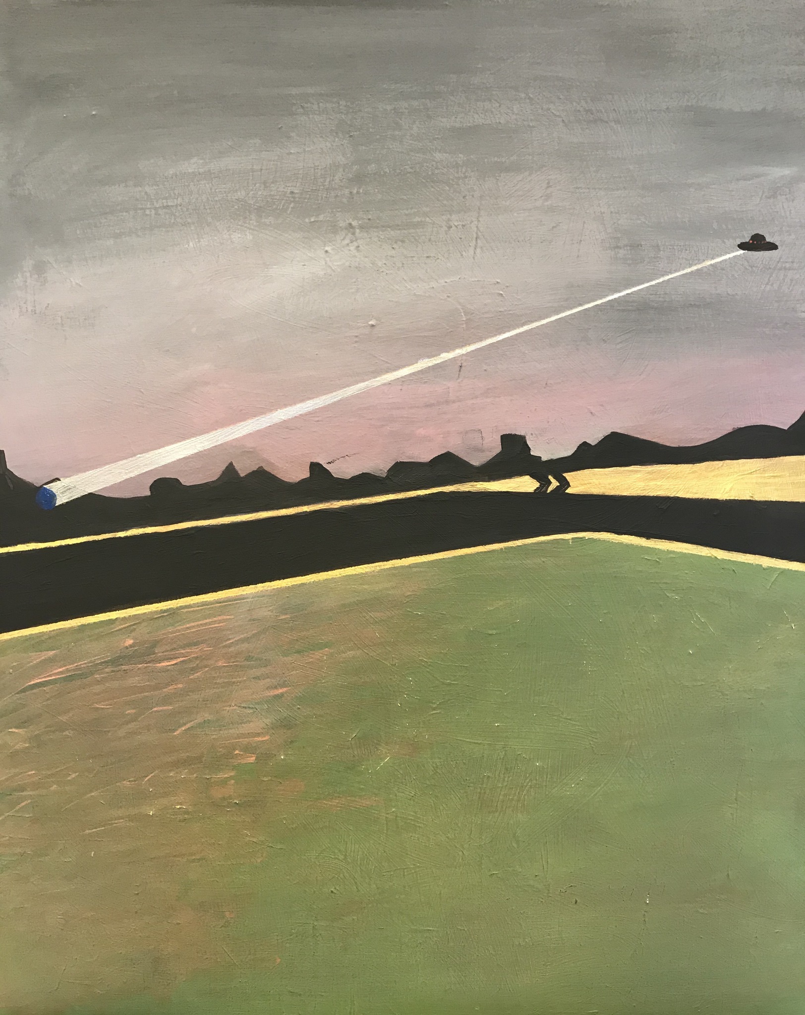 Ik schilder met acryl op doek met soms architectonische achtergronden. Met de menselijke figuren die ik erin aanbreng (geschilderd of als collage) probeer ik een verhaal te vertellen.