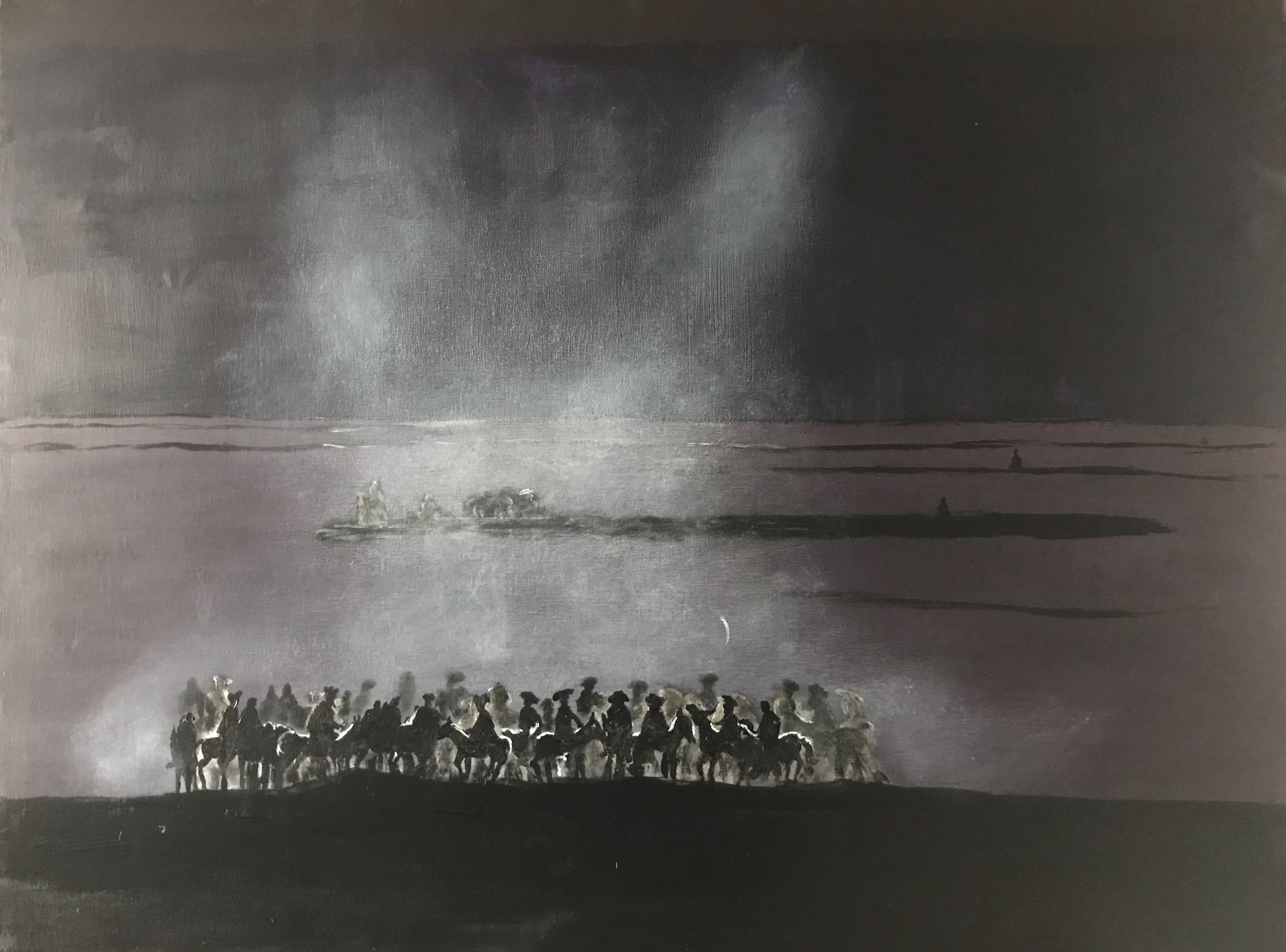 Ik schilder met acryl op doek met soms architectonische achtergronden. Met de menselijke figuren die ik erin aanbreng (geschilderd of als collage) probeer ik een verhaal te vertellen.