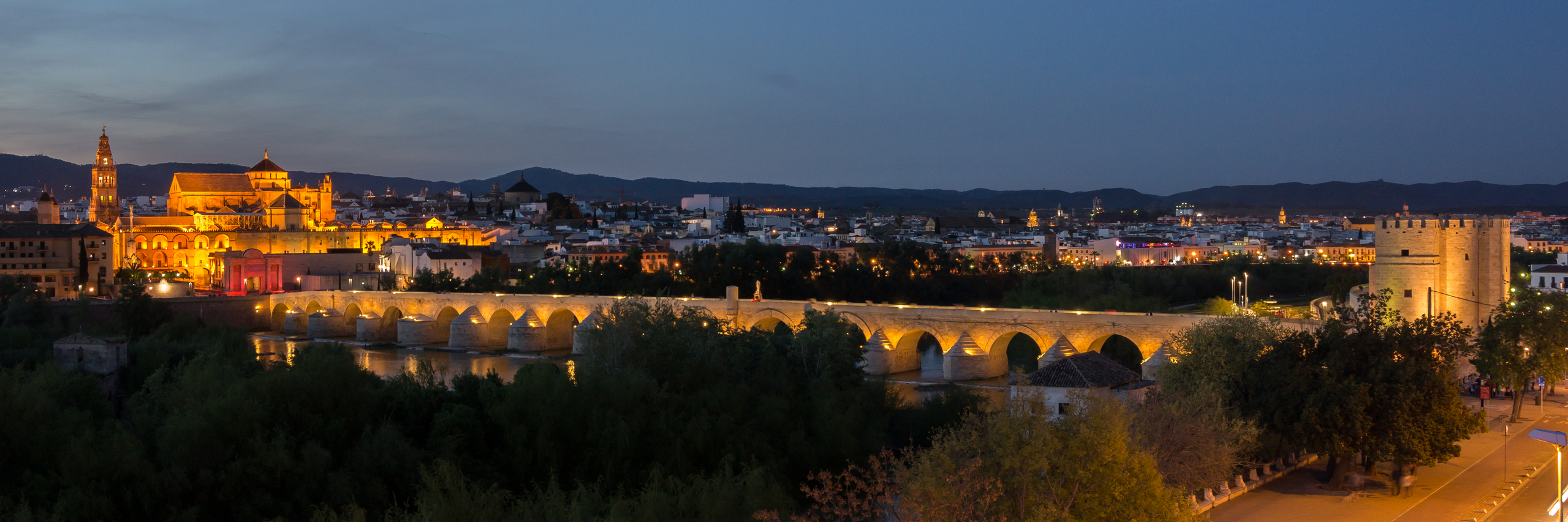 Stadsgezicht (3:1) Cordoba in de avond vanaf het dakterras van hotel Hesperia met links de Mezquita Kathedraal, in het midden de Puente Romano over de Guadalquivir rivier en rechts de Torre de la Calahorra.