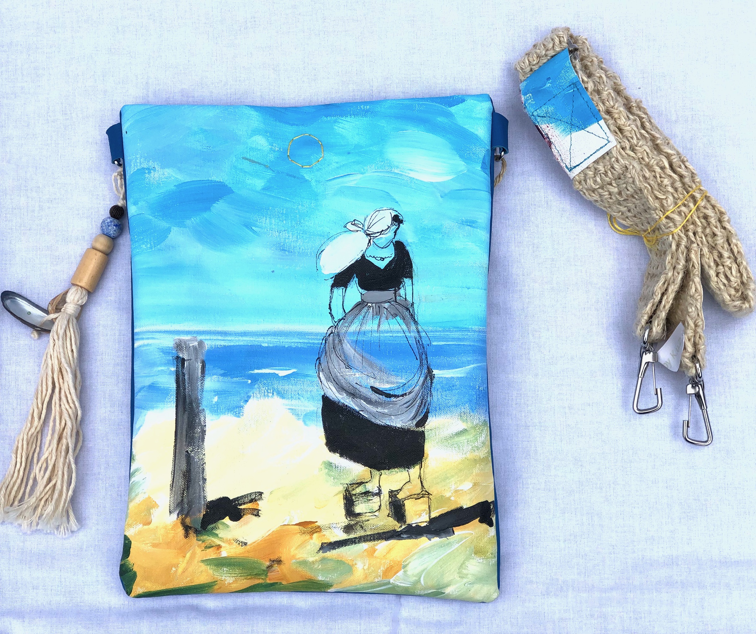 Aan het strand in volle dracht. Acryl op doek, leren achterkant, gehaakte schouderriem.