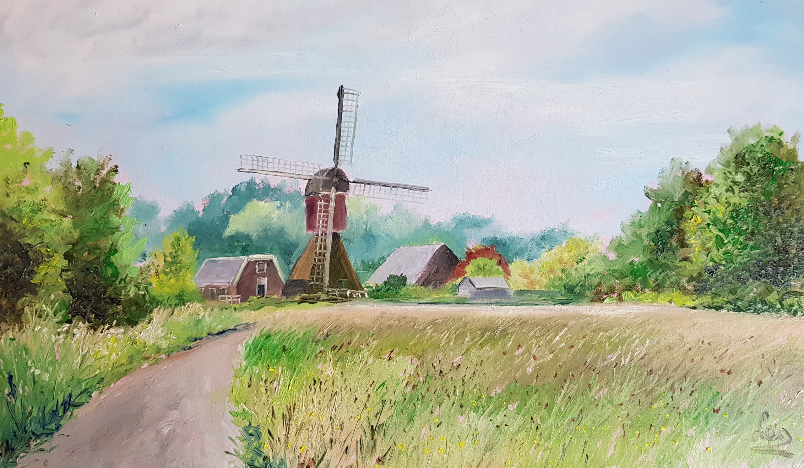 De Westveense molen is geschilderd tijdens de opname van een filmpje waarin u kunt zien hoe ik te werk ga. Dit filmpje is te vinden op You tube