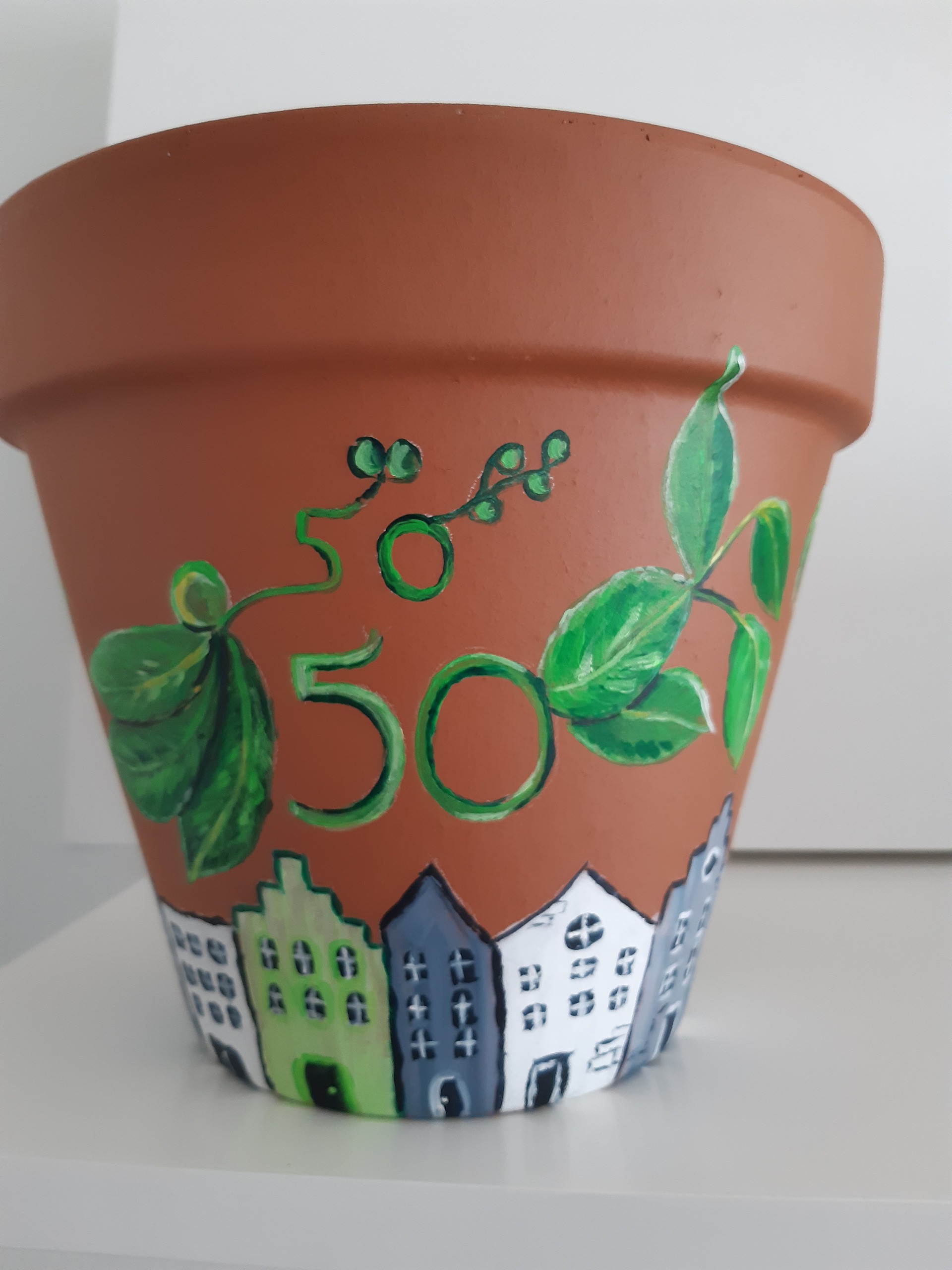 Bechilderde bloempot voor iemand die 50 werd. Kan voor iedere gelegenheid beschilderd worden