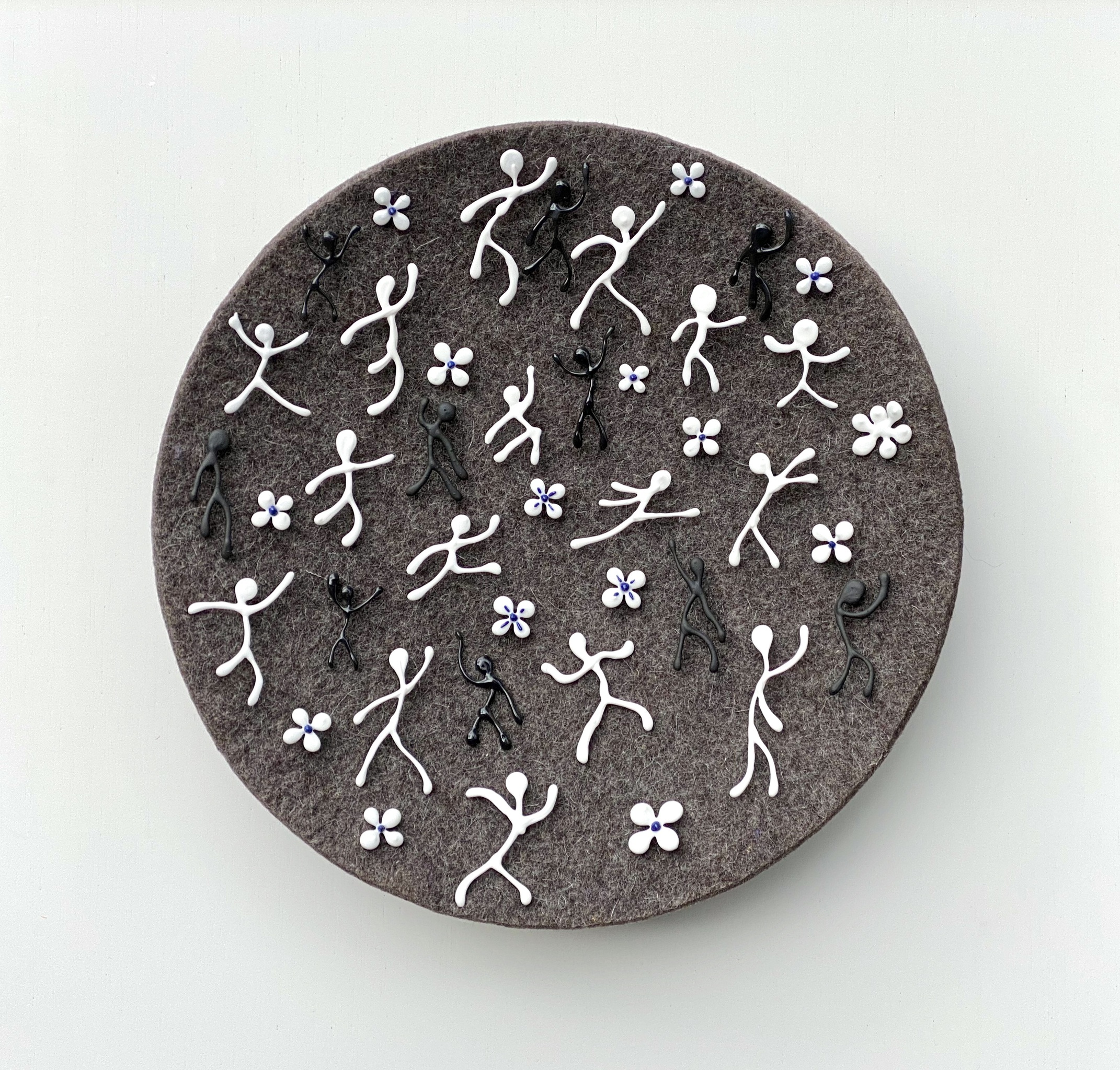Vilten wandsculptuur met "zwevende" porseleinen elementjes