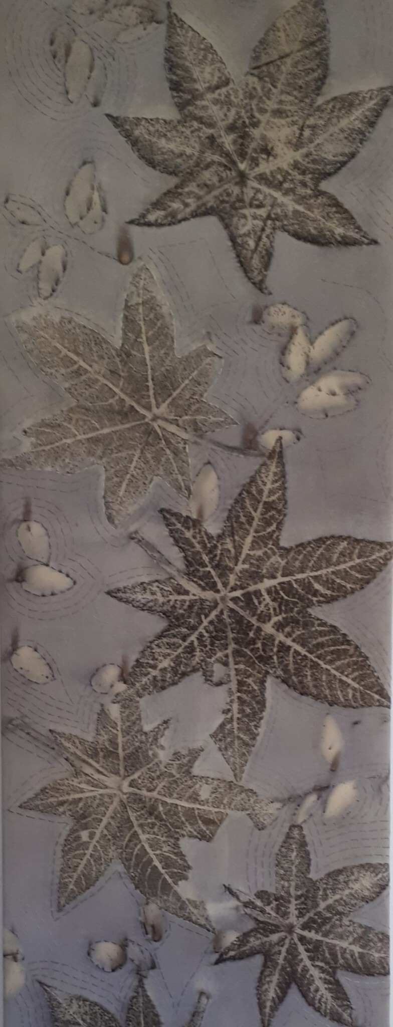 Ecoprint op katoen, 40x120 cm, in grijs/ blauwe tinten. De stof is om een houten frame gespannen.