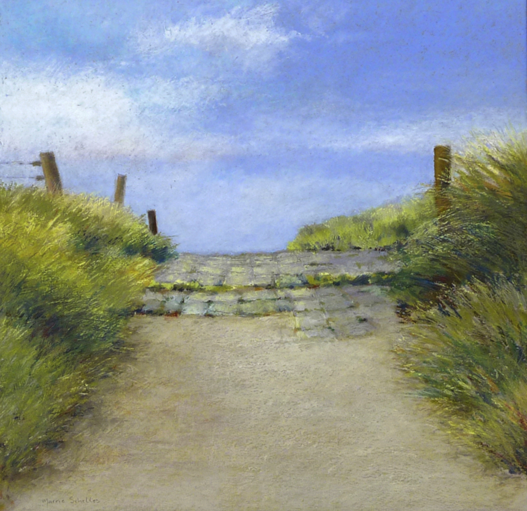 Strandopgang in oliepastelkrijt. Inclusief passe-partout. Lijstmaat 50x50 cm.