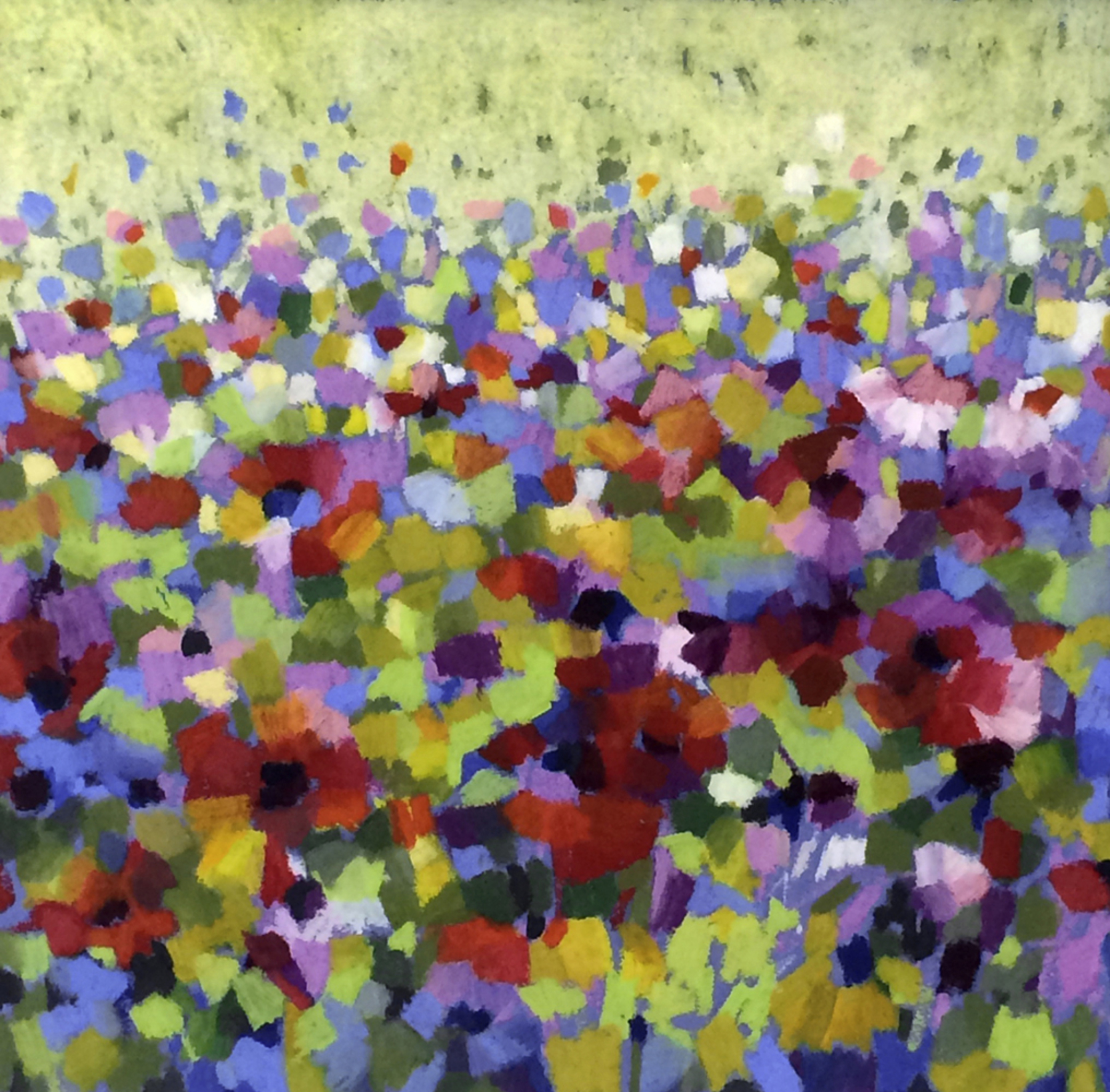 Bloemenveld II in oliepastelkrijt. Inclusief passe-partout. Lijstmaat 60x60 cm.