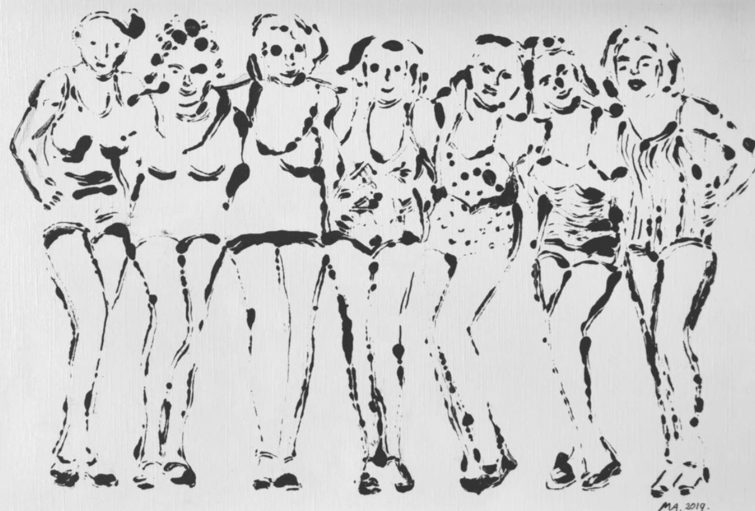 Geinspireerd op een uitje met een vriendinnenclubje. Acryl afdruk op papier.