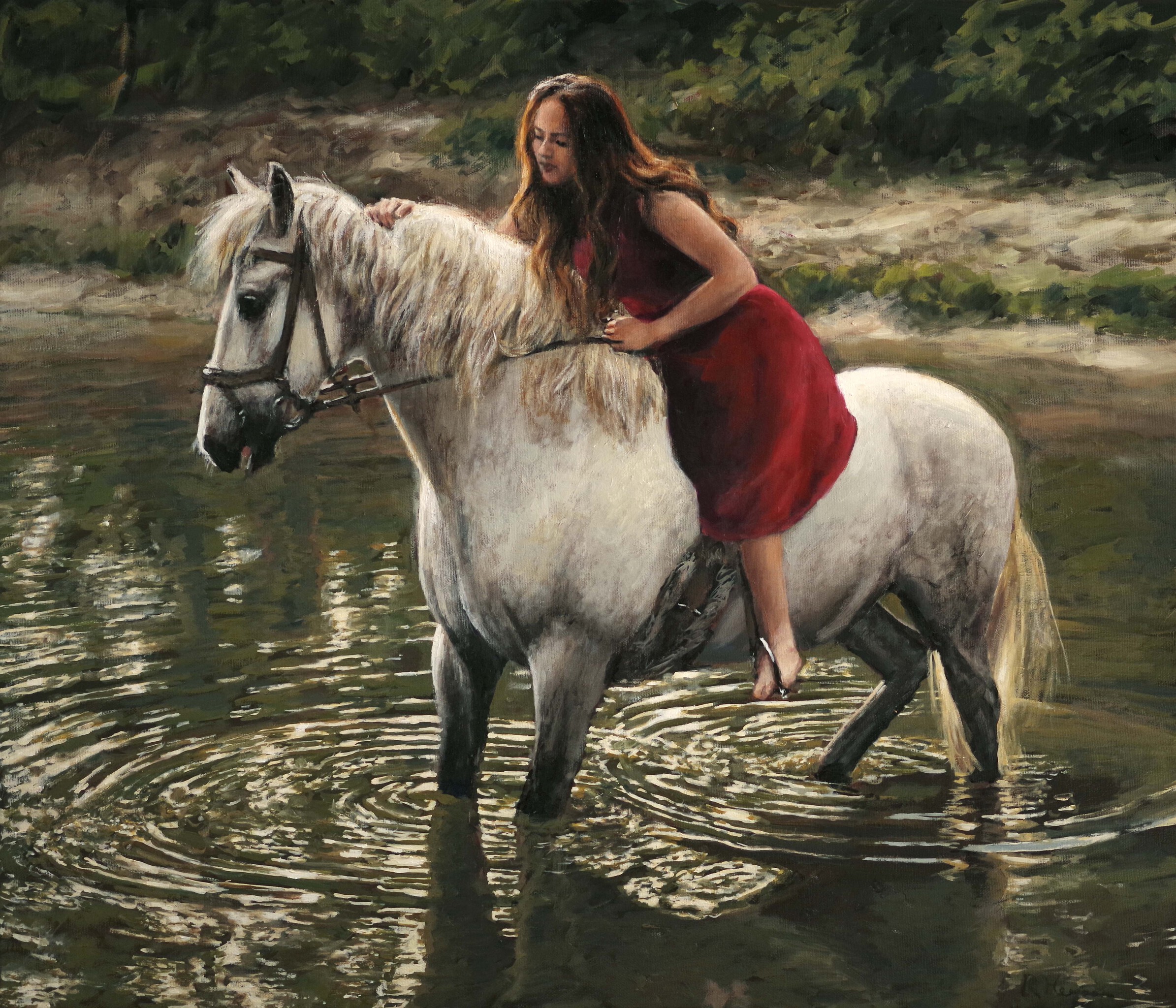 Vrouw Water Paard Horse Amazone Ruiter Schimmel Equine
