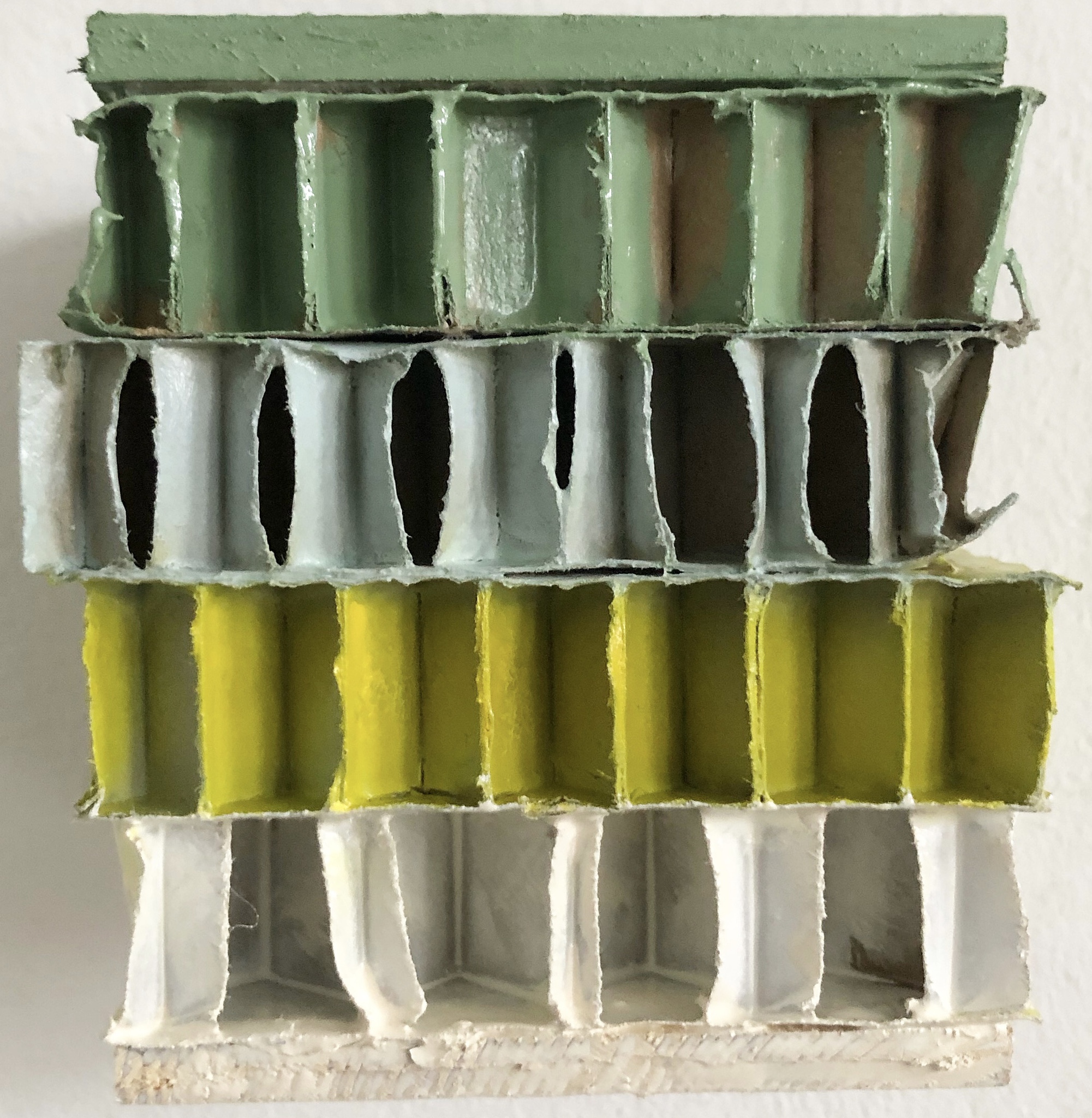 Recycled cardboard wall object. Acrilic- and oilpaint and wood