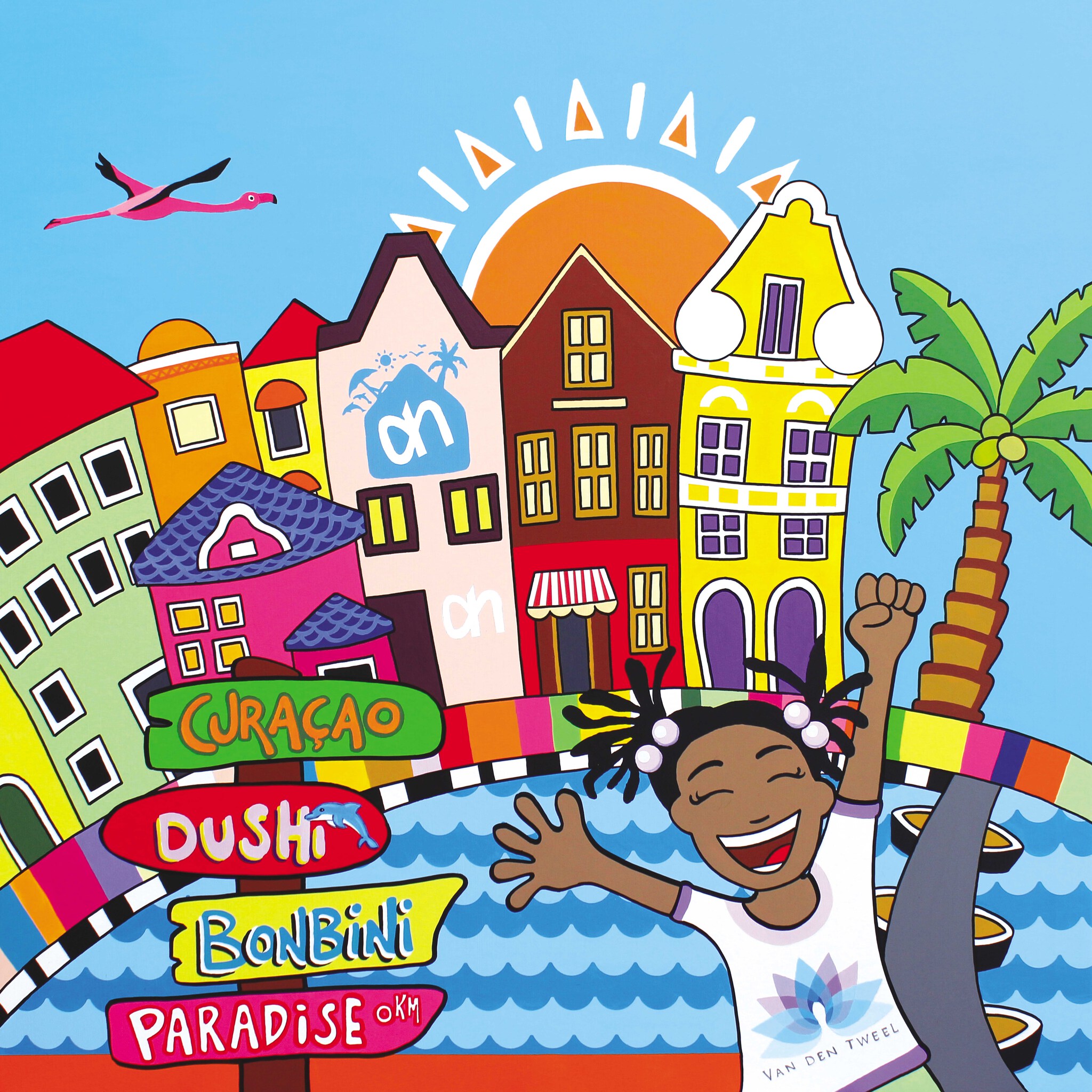 Dit is de eerste uit de serie kleurrijke tropische tassen voor Van den Tweel (Albert Heijn) Hiervoor heb ik natuurlijk gekozen voor een hele vrolijke uitstraling dus de huisjes van de zeer bekende Handelskade in Punda met op de voorgrond een blij locaal meisje met leuke staartjes. Dit is een heel leuk souvenir herbruikbaar en handig want iedereen moet toch boodschappen doen. Dan is dat vanaf nu lekker kleurrijk en dat is gezellig.