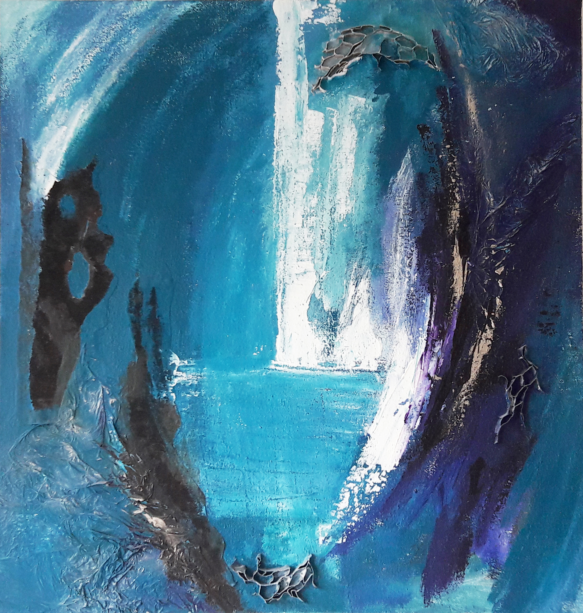 Een schilderij in blauwtinten, waarbij je het idee hebt dat je door een soort tunnel kijkt. Naast acrylverf zijn er nog allerlei andere materialen gebruikt, zoals stof, karton en vloeipapier. Het is geschilderd op jute.