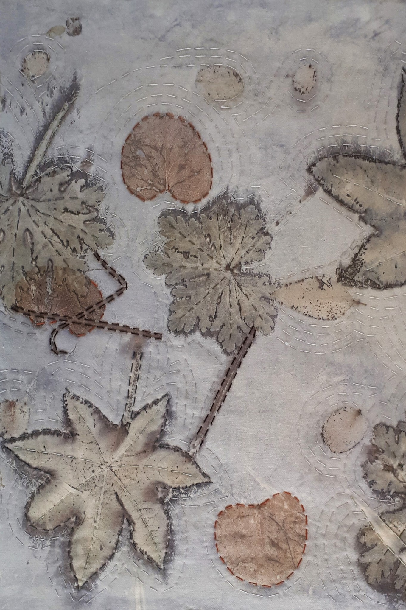 Ecoprint op katoen 30x45 cm, met handborduurwerk in zachte grijs/blauwe tinten. Het werk zit in een licht grijs passe partout. Ecoprint met het blad van eucalyptus, geranium en castor.