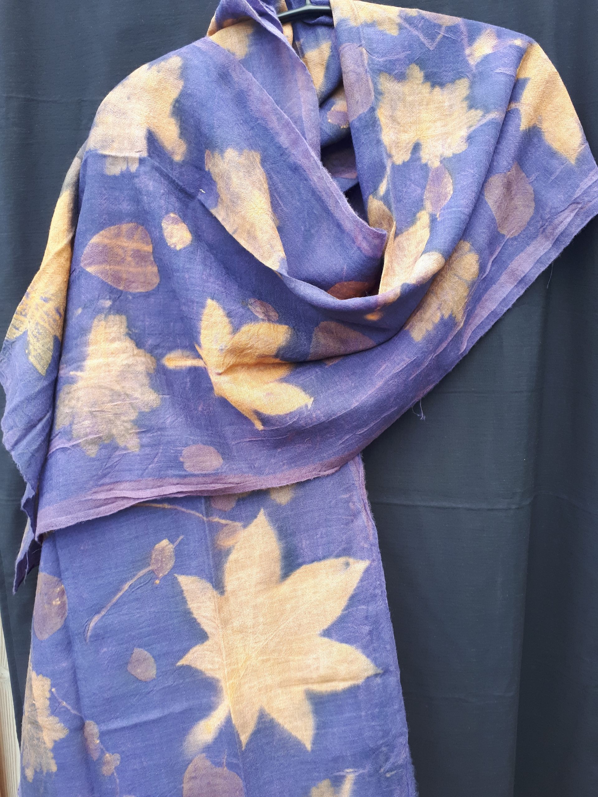 Mooie grote sjaal van wol etamine. Geverf in blauwhout en ecoprint blad van de Castor plant en eucalytus.