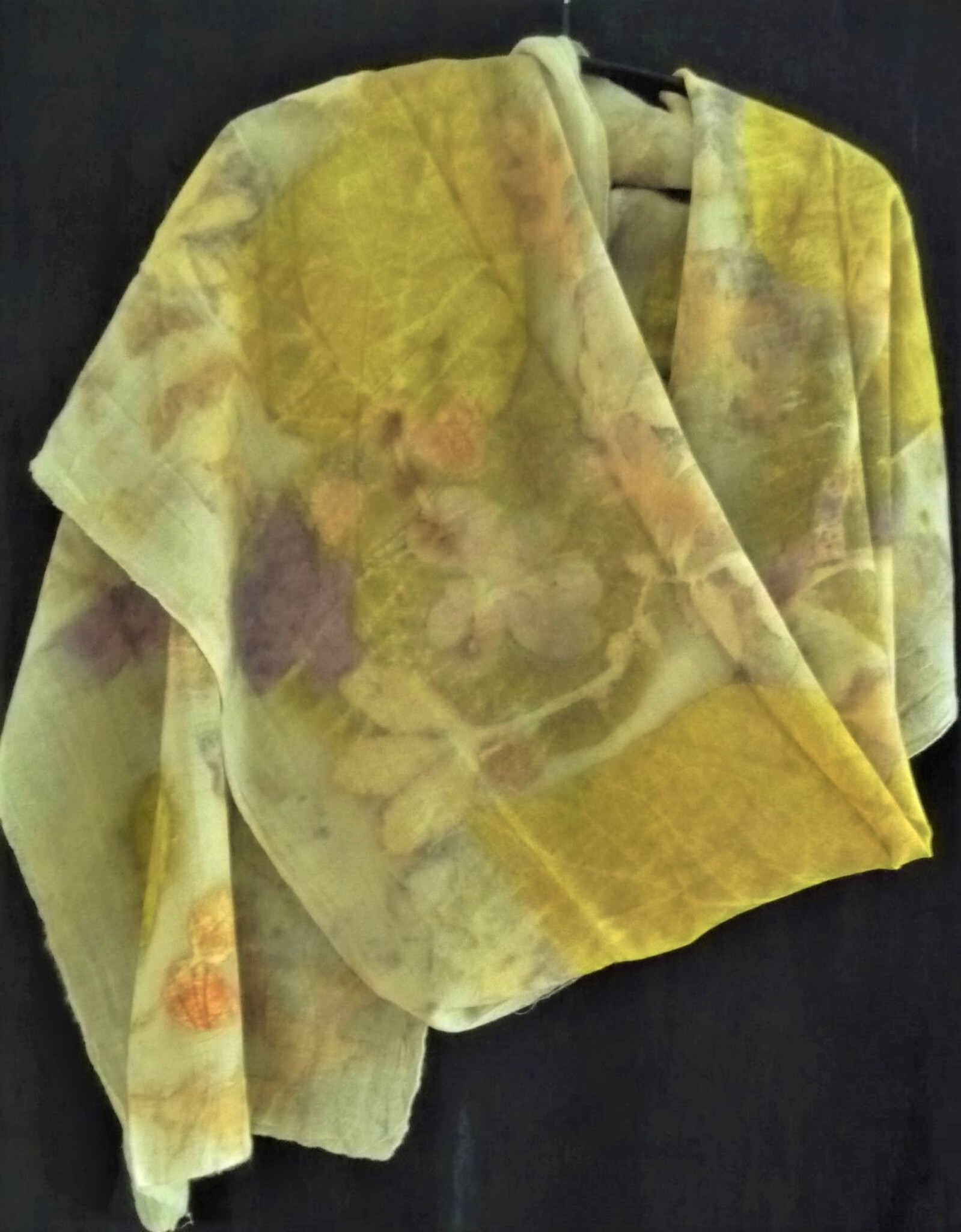 Mooie grote sjaal van wol etamine met een licht beige achtergrond. Ecoprint met diverse bladeren oa catalpa en kastanje Het vleugje blauwhout geeft een bijzonde reffect.
